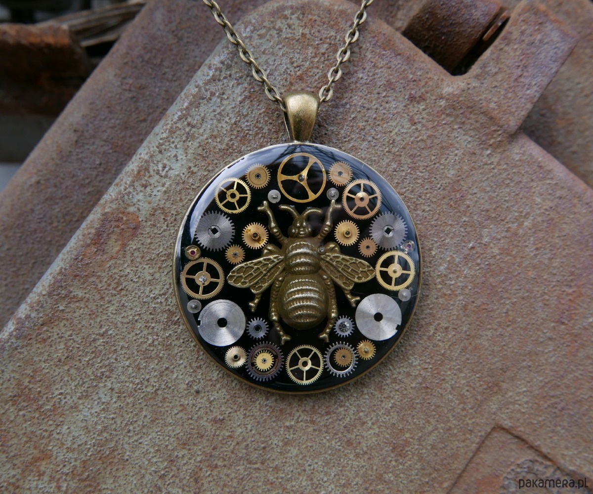 Wyjątkowy mosiężny naszyjnik w stylu steampunk. W okrągłej zawieszce zamknięto kompozycję z oryginalnych części mechanizmu zegarka i mosiężnej pszczoły.