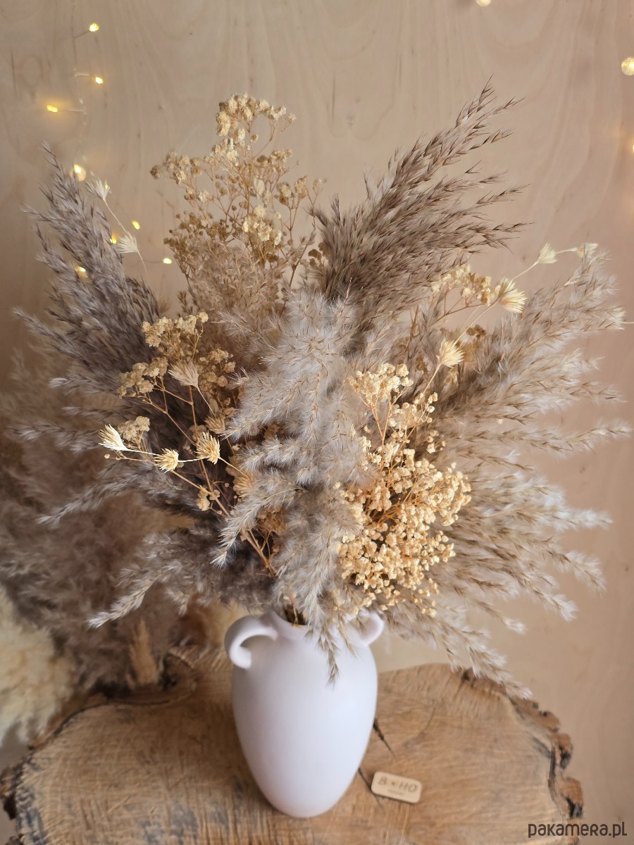 Ten bukiet z trawą pampasową i gipsówką to gotowa kompozycja, którą ustawiasz w wazonie i od razu wnętrze zyskuje przytulny efekt - idealny, jeśli chcesz dodać ciepły i naturalny akcent.