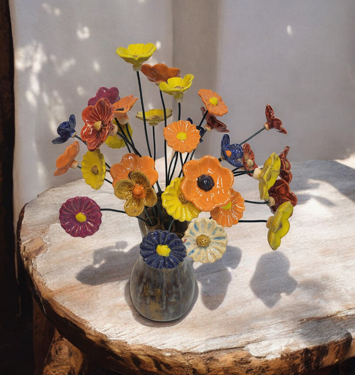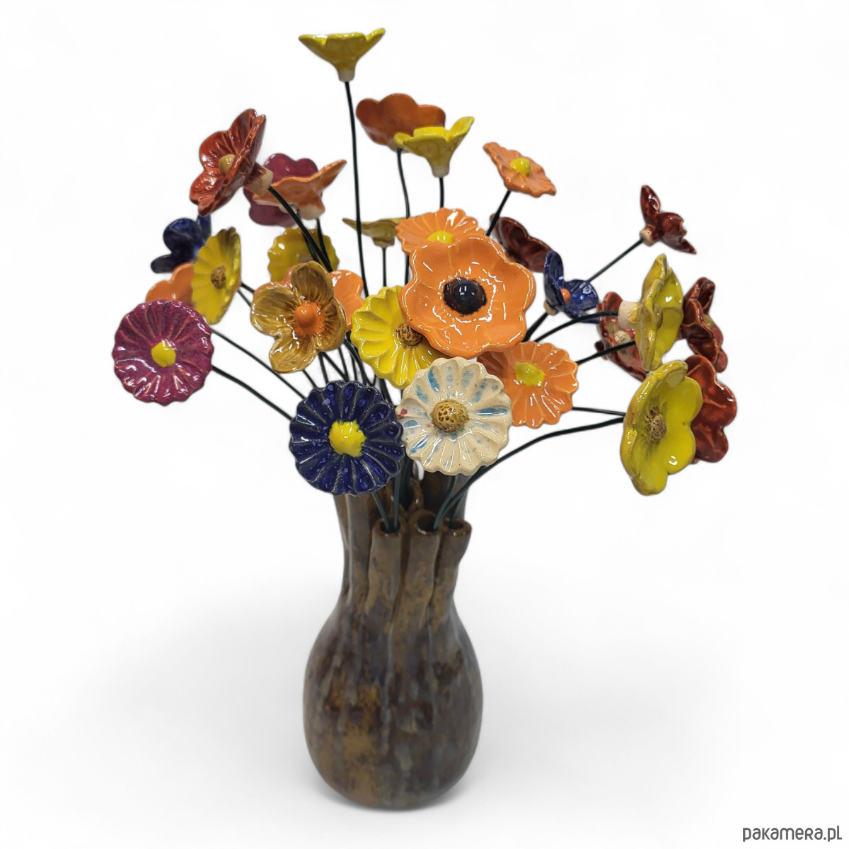 Kompozycja 30 ceramicznych kwiatów osadzona w oryginalnym wazonie.