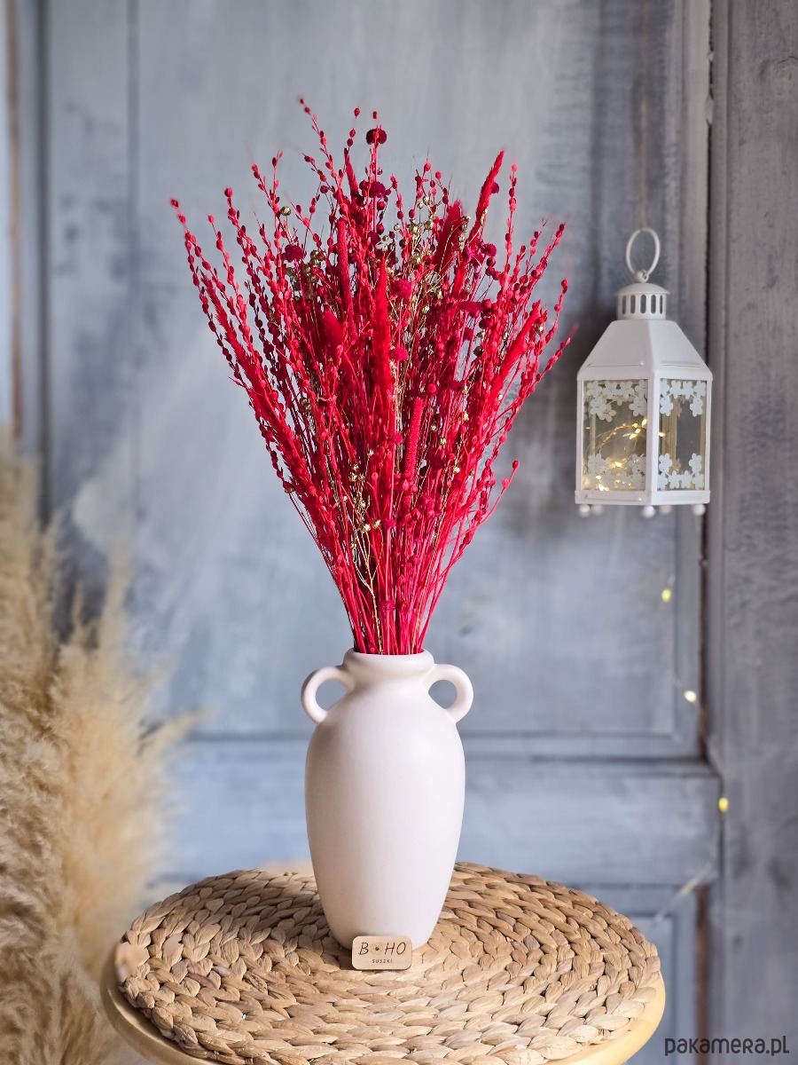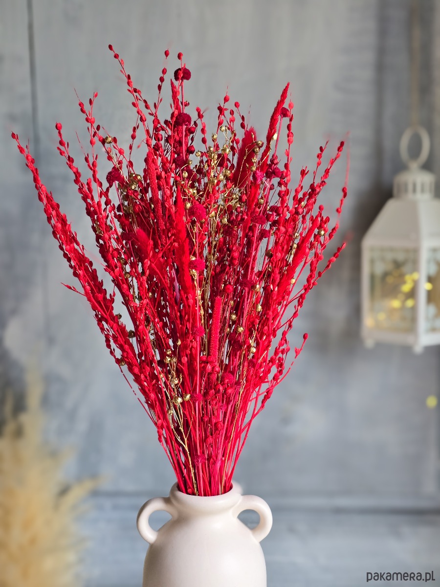 Bukiet czerwono-złoty - elegancka dekoracja do wazonu, która doda wnętrzu koloru i wyjątkowego charakteru. Wykonany ręcznie z suszonych roślin, zachwyca intensywną czerwienią i subtelnymi złotymi akcentami.