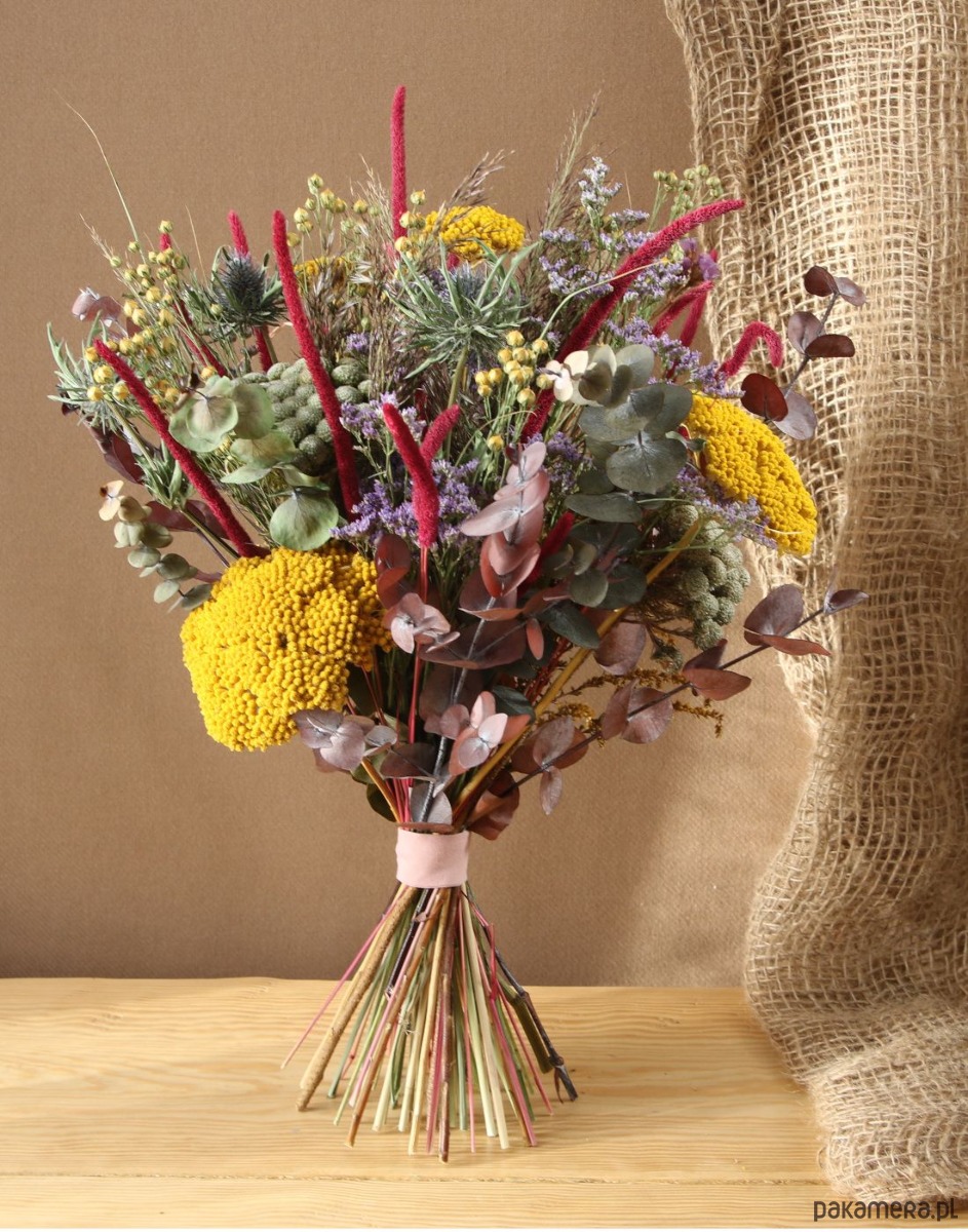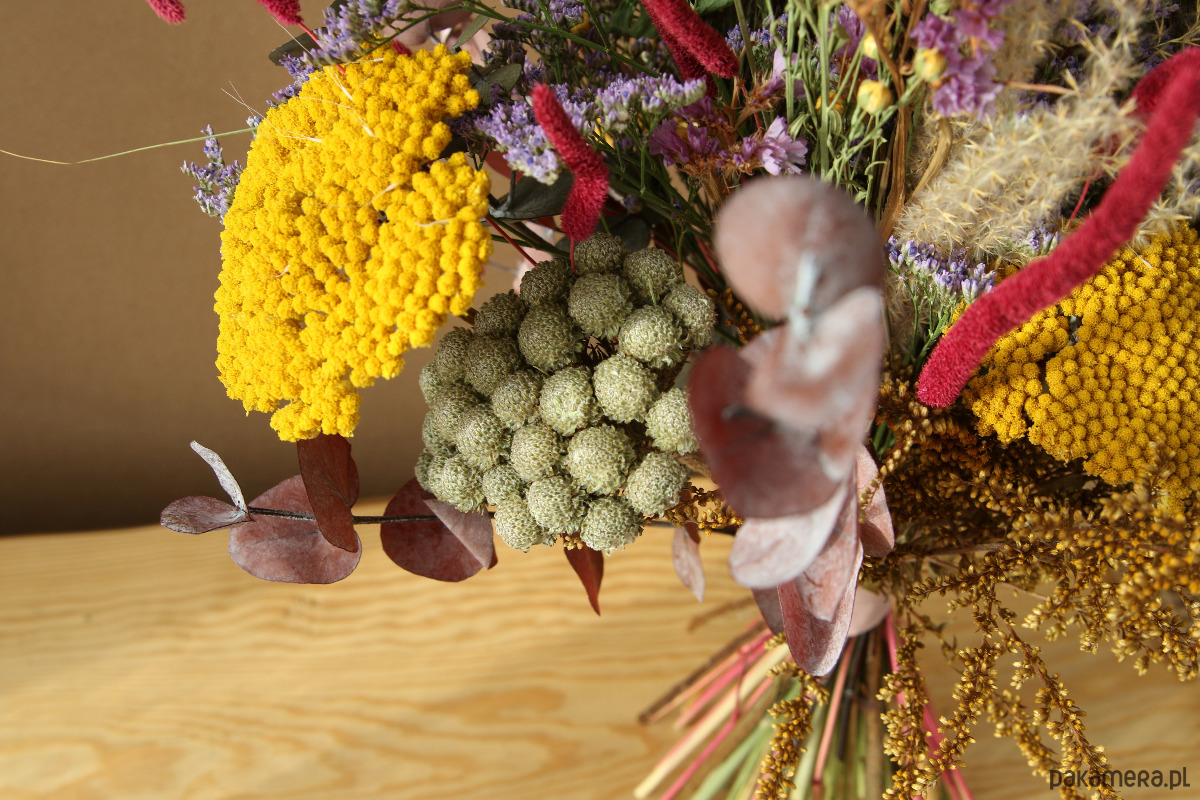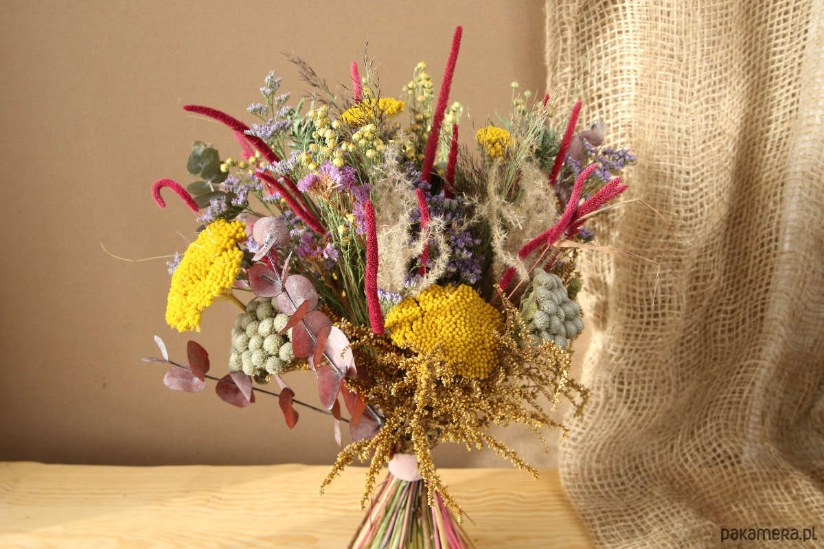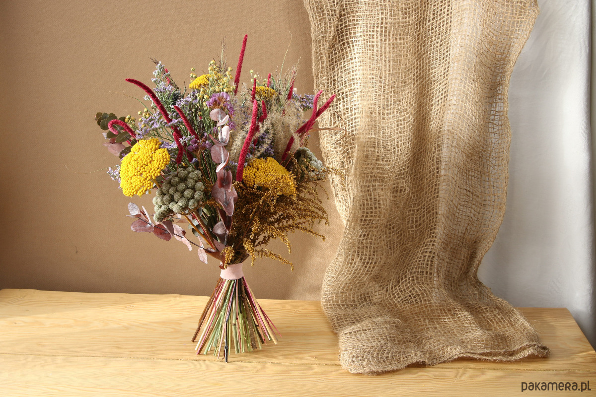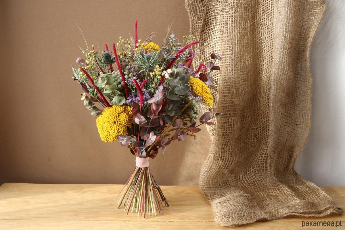 Bukiet z roślin suszonych i stabilizowanych. Wesoły, kolorowy, ale dzięki dodatkowi wielu nieoczywistych roślin jak mikołajek, brunia czy miskant, posiada niebanalny, nieco zadziorny urok. Doskonały do wnętrz rustykalnych, ale też nowoczesnych przestrzeni. Wprowadza optymistyczny nastrój.