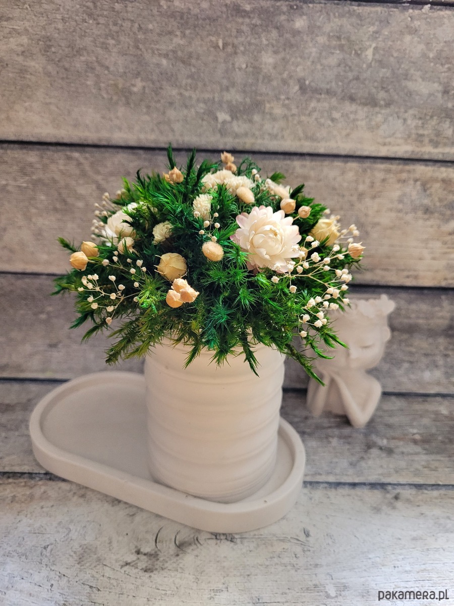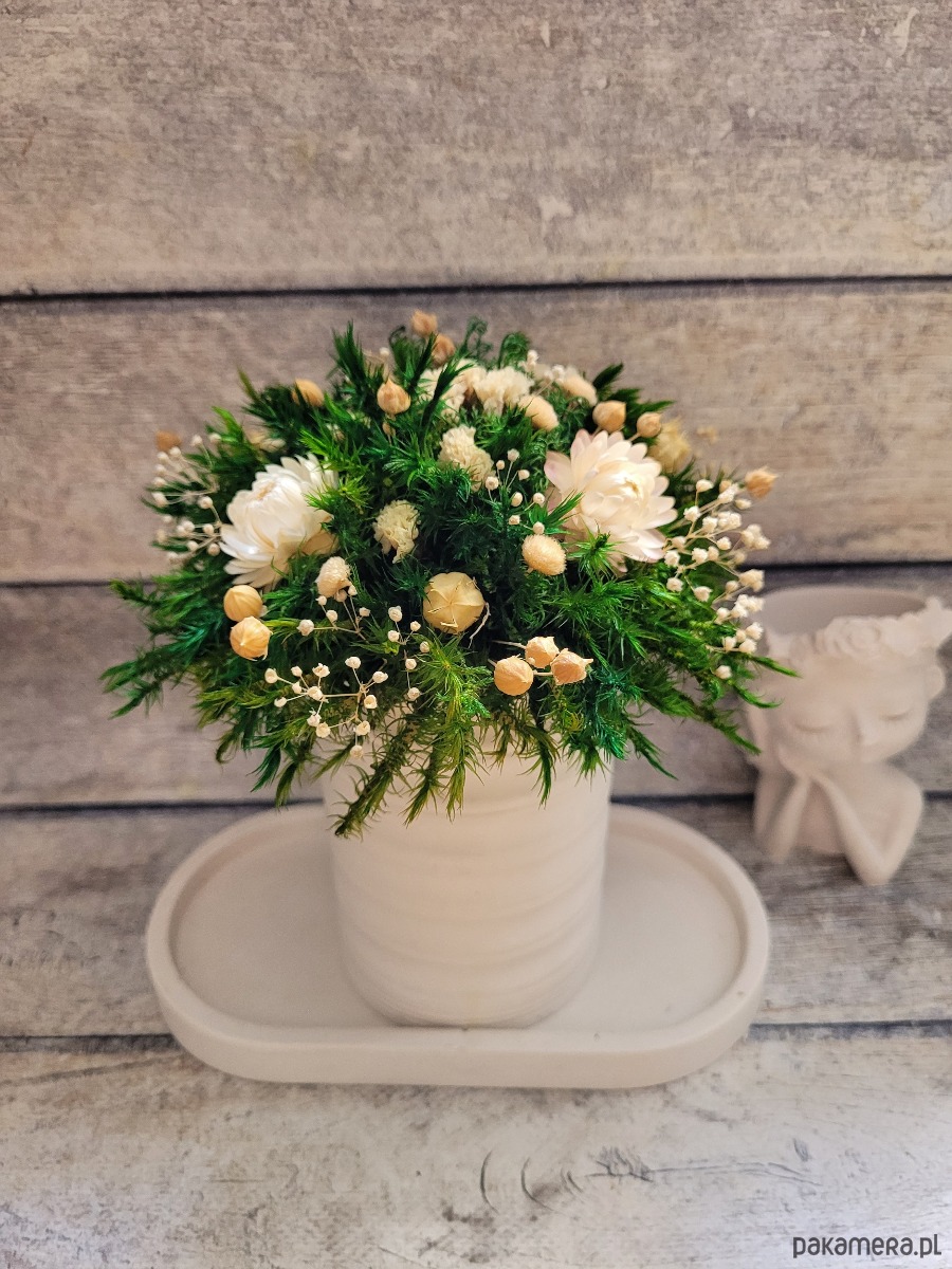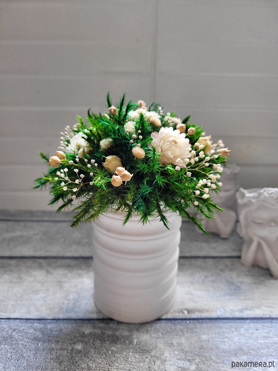 Jasna, delikatna kompozycja wprowadza harmonię i przytulność. To wyjątkowy prezent na każdą okazję, który doda ciepła i radości otoczeniu.