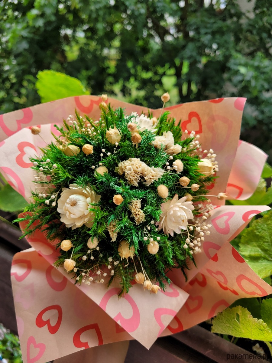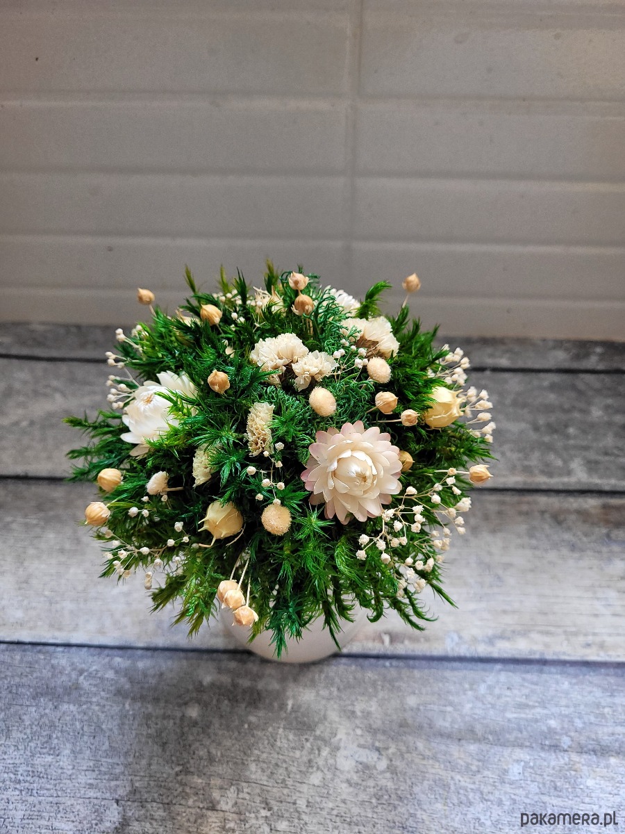 Bukiet składa się z stabilizowanego mchu oraz różnych gatunków suchych kwiatów.