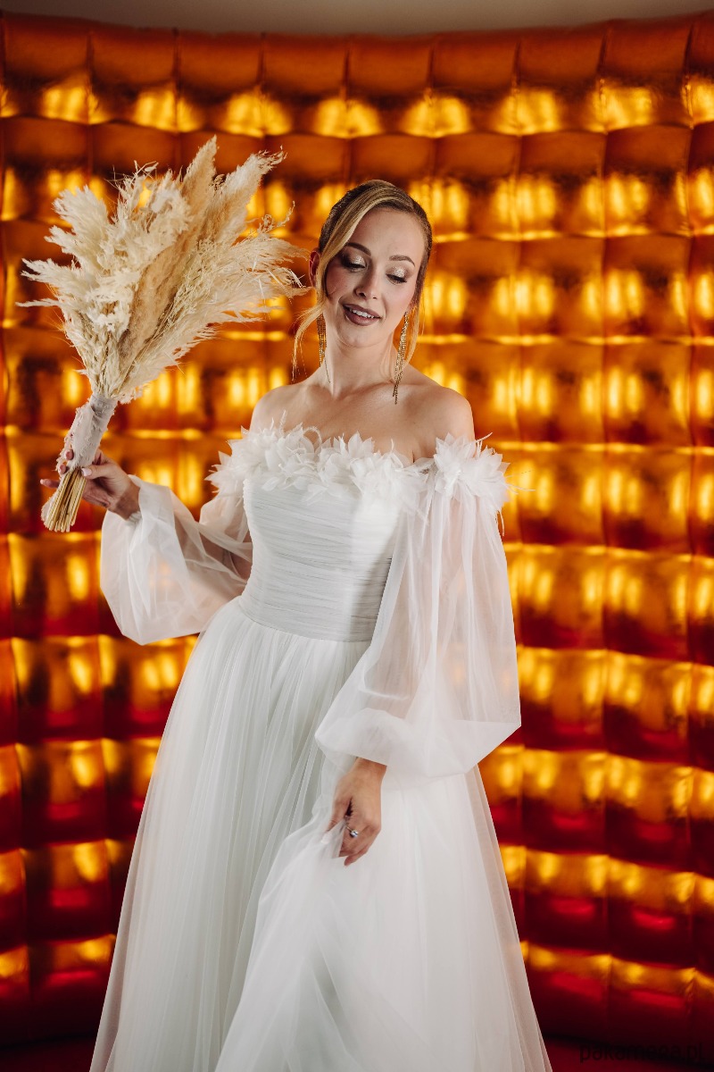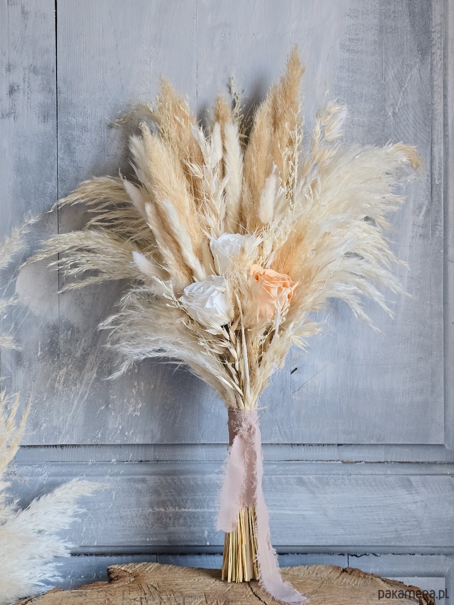 Jeśli szukasz lekkiego, subtelnego bukietu pasującego do romantycznej, boho stylizacji - ten bukiet sprawdzi się idealnie. To jednostronna kompozycja z traw pampasowych, róż stabilizowanych, bielonego dzikiego owsa, dmuszka jajowatego i limonium. Owinięty szyfonową wstążką, która dodaje lekkości i miękkiego wykończenia.