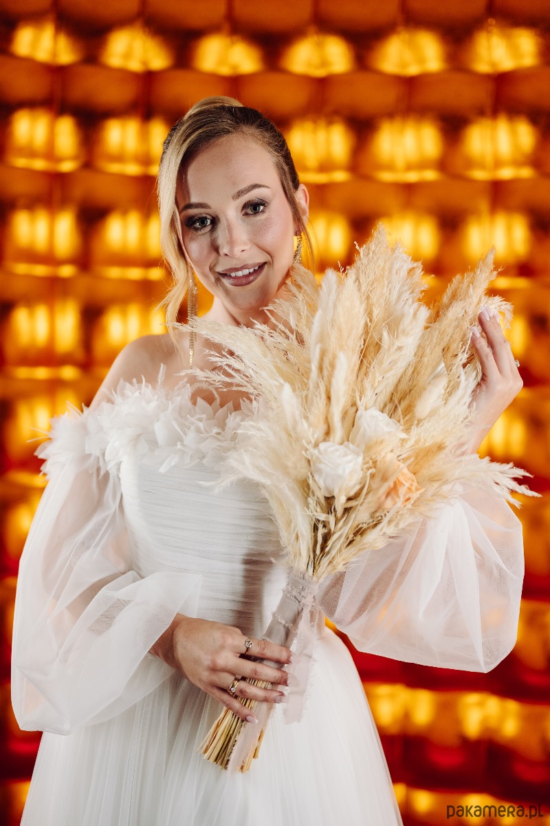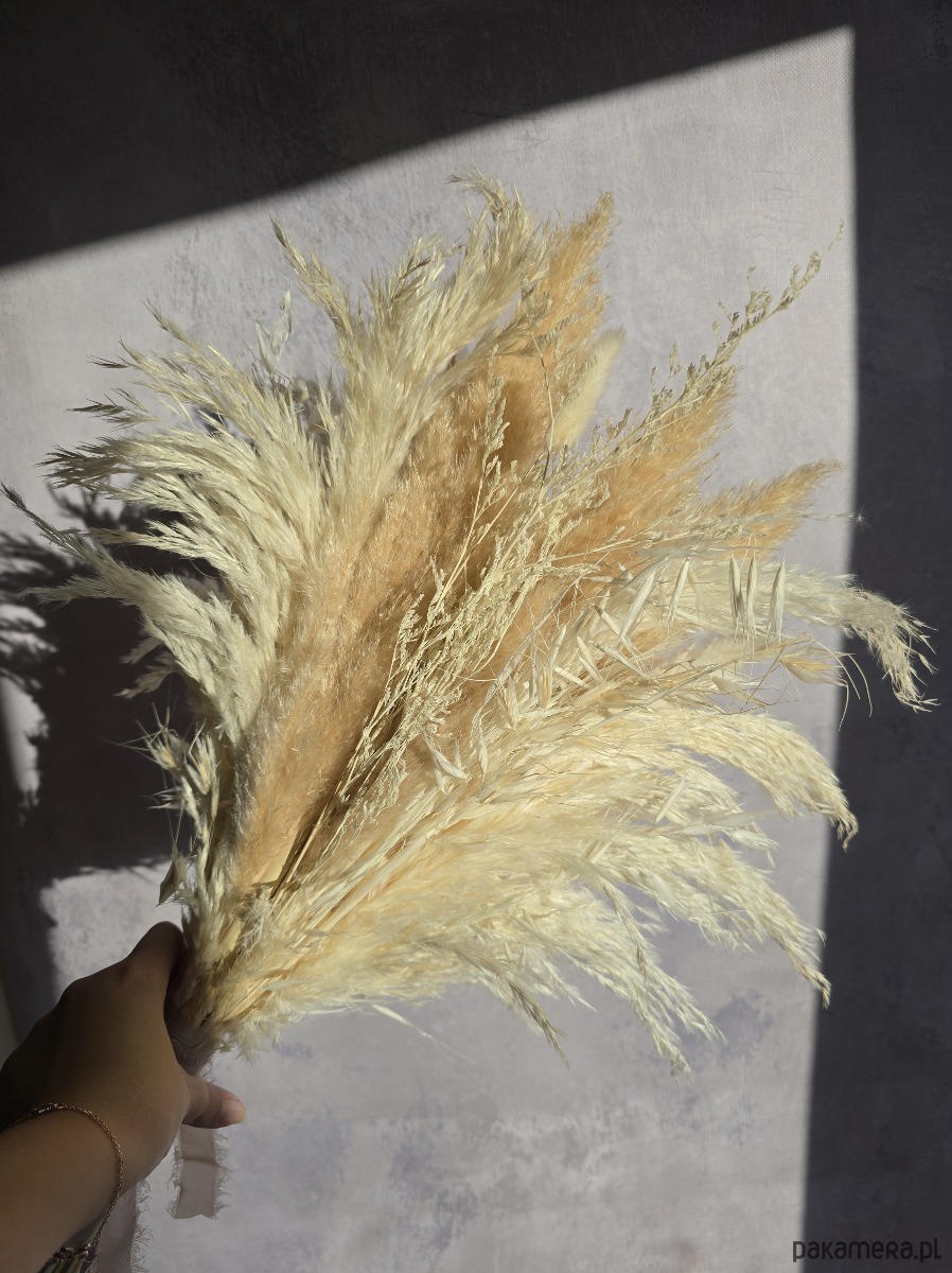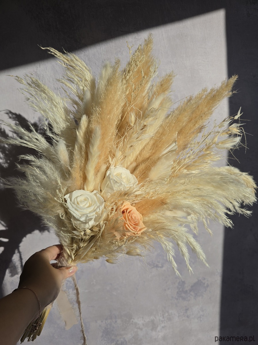 Jeśli szukasz lekkiego, subtelnego bukietu pasującego do romantycznej, boho stylizacji - ten bukiet sprawdzi się idealnie. To jednostronna kompozycja z traw pampasowych, róż stabilizowanych, bielonego dzikiego owsa, dmuszka jajowatego i limonium. Owinięty szyfonową wstążką, która dodaje lekkości i miękkiego wykończenia.