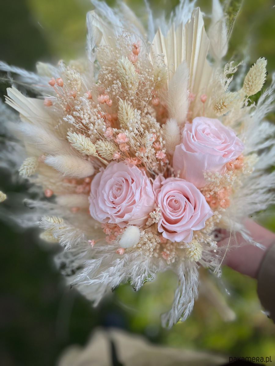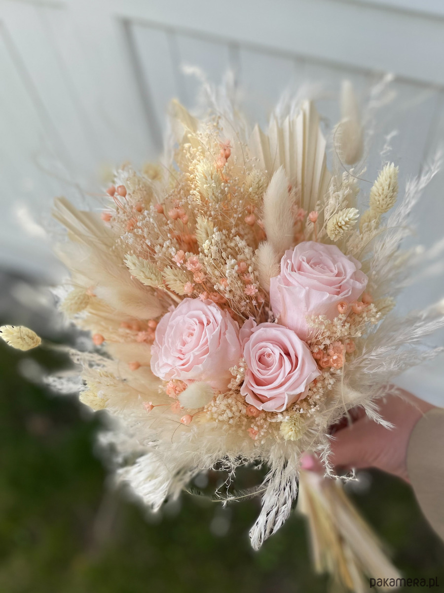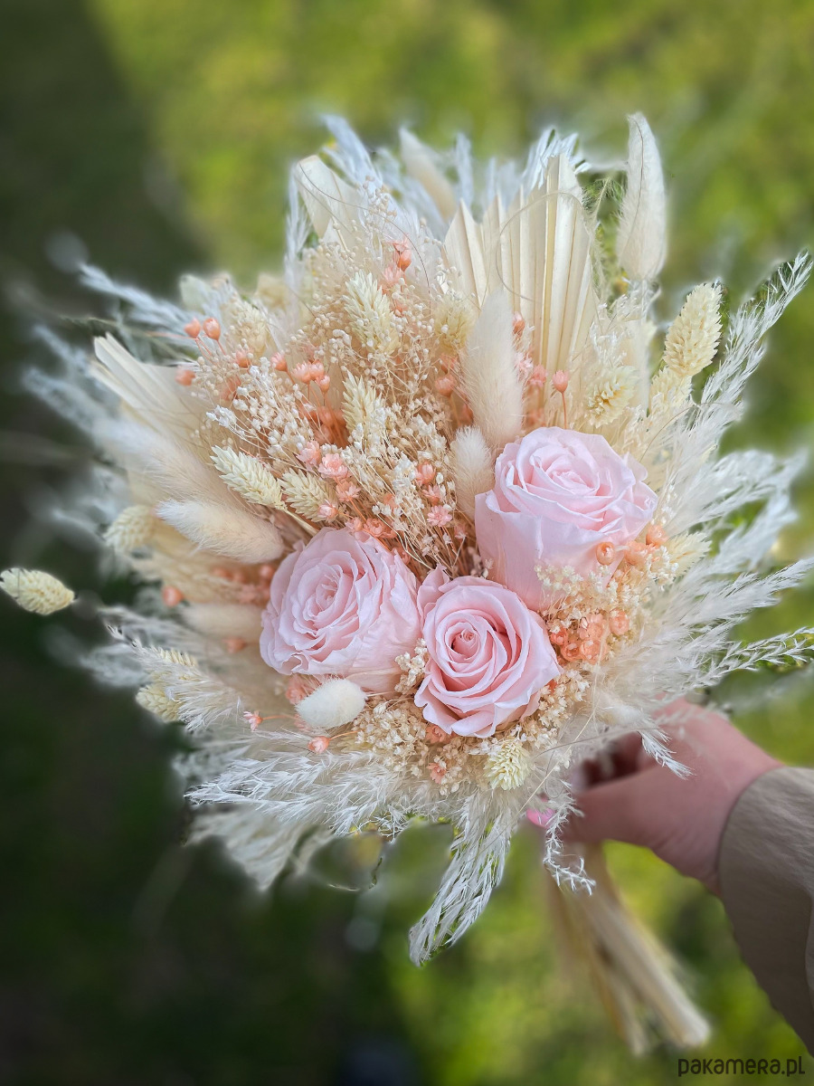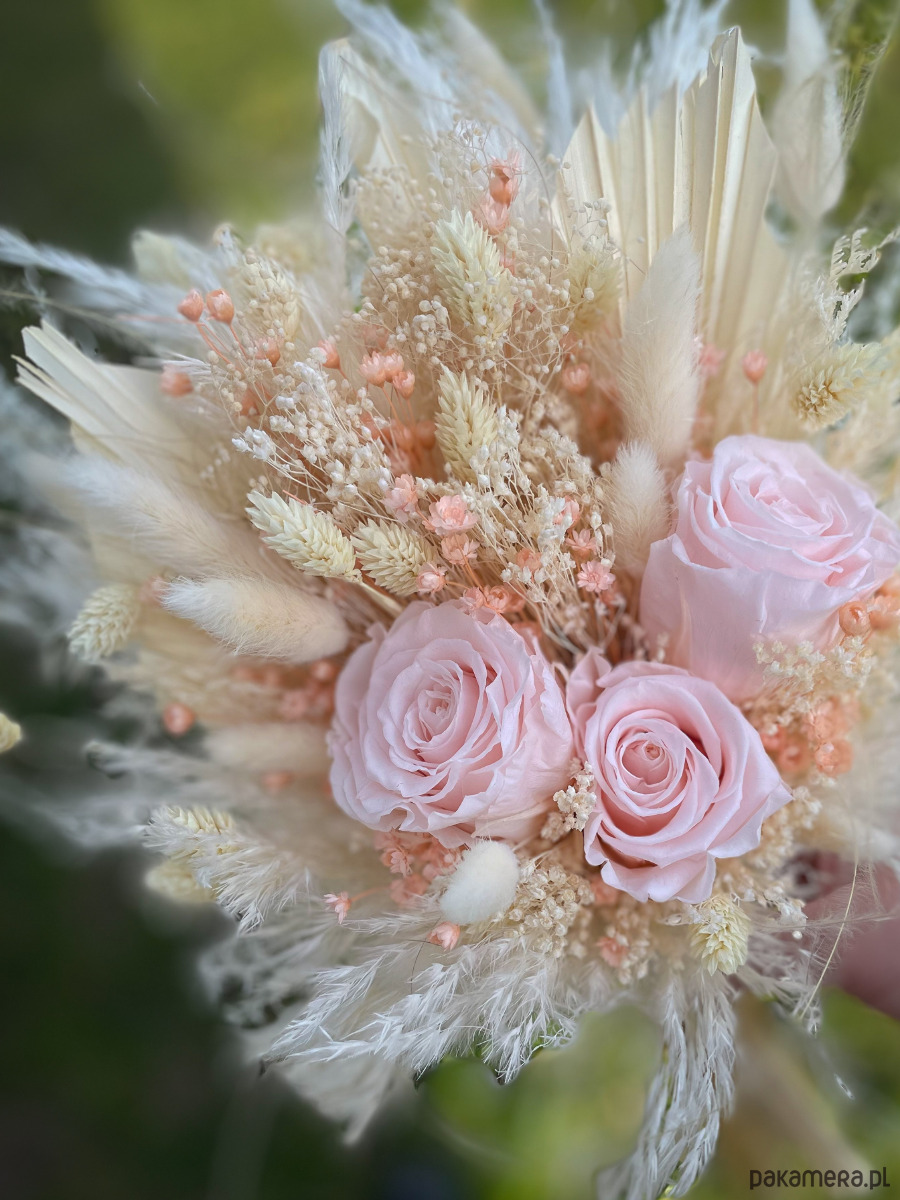 Bukiet słada się z wiecznych róż w kolorze pudrowego różu, traw pampasowych, bielonych liści palmy oraz innych starannie dobranych suszonych kwiatów i traw. Każdy element został wybrany z myślą o stworzeniu bukietu, który emanuje subtelnością i romantyzmem.