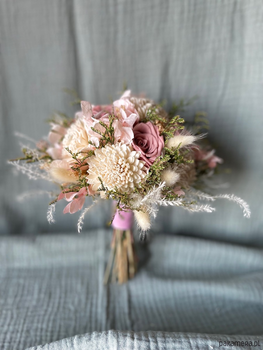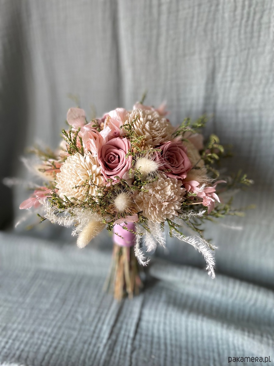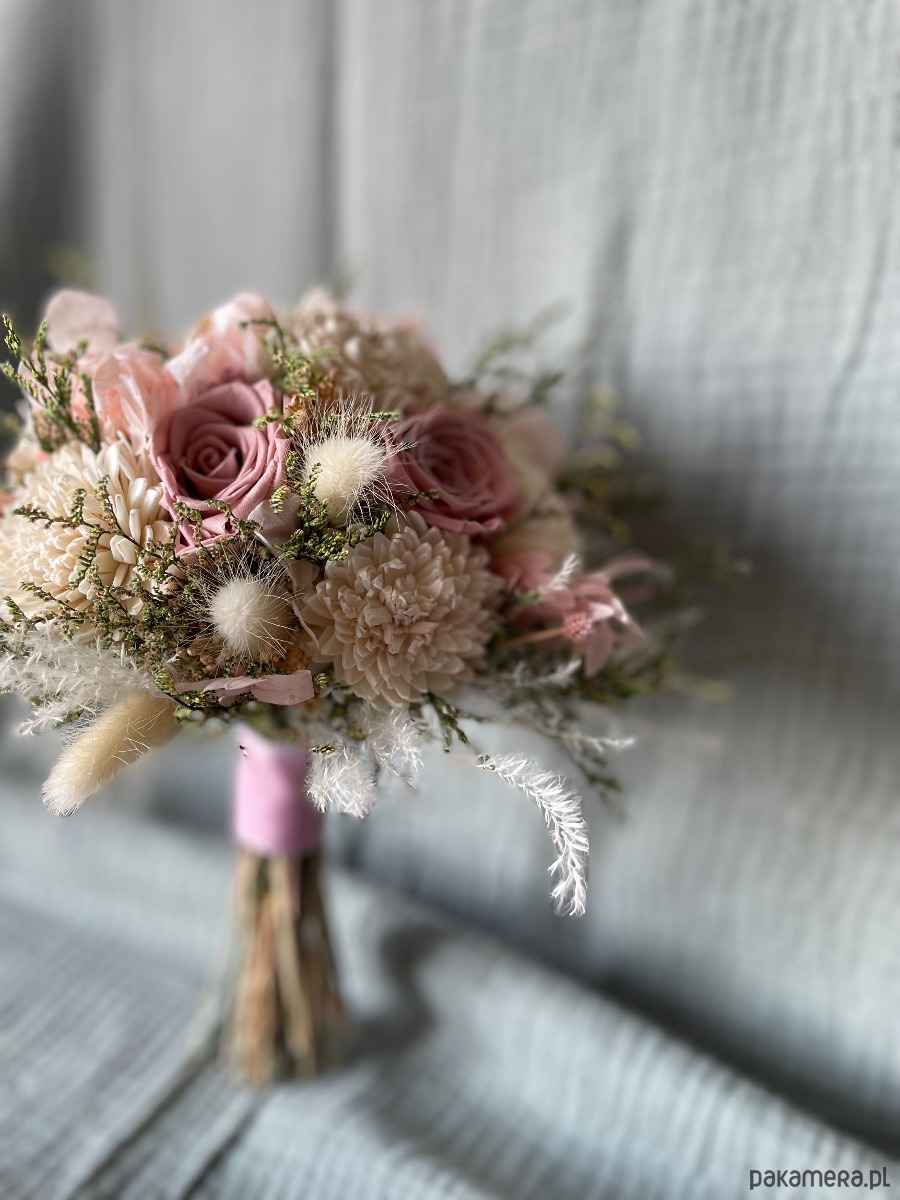 Bukiet ślubny w pastelowych kolorach wykonany z naturalnie suszonych i stabilizowanych kwiatów.