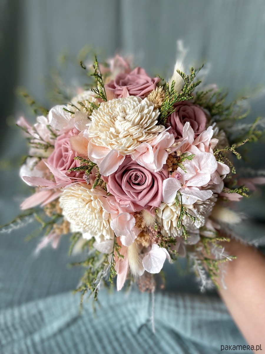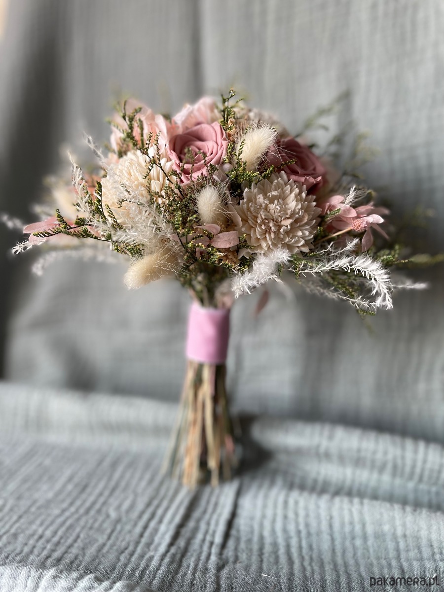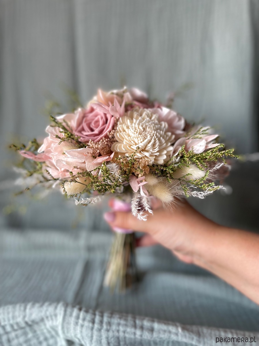 Bukiet ślubny w pastelowych kolorach wykonany z naturalnie suszonych i stabilizowanych kwiatów.