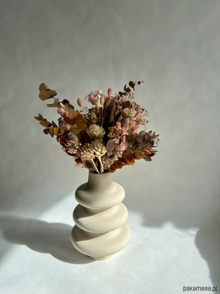 Zachwycający bukiet jesienny w pięknych stonowanych kolorach - to propozycja, która doda Twojemu domowi dużo jesiennego ciepła. Możesz wykorzystać go w swoim mieszkaniu, salonie, biurze, hotelu lub restauracji.