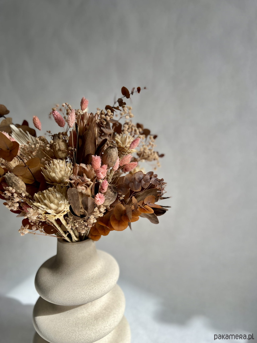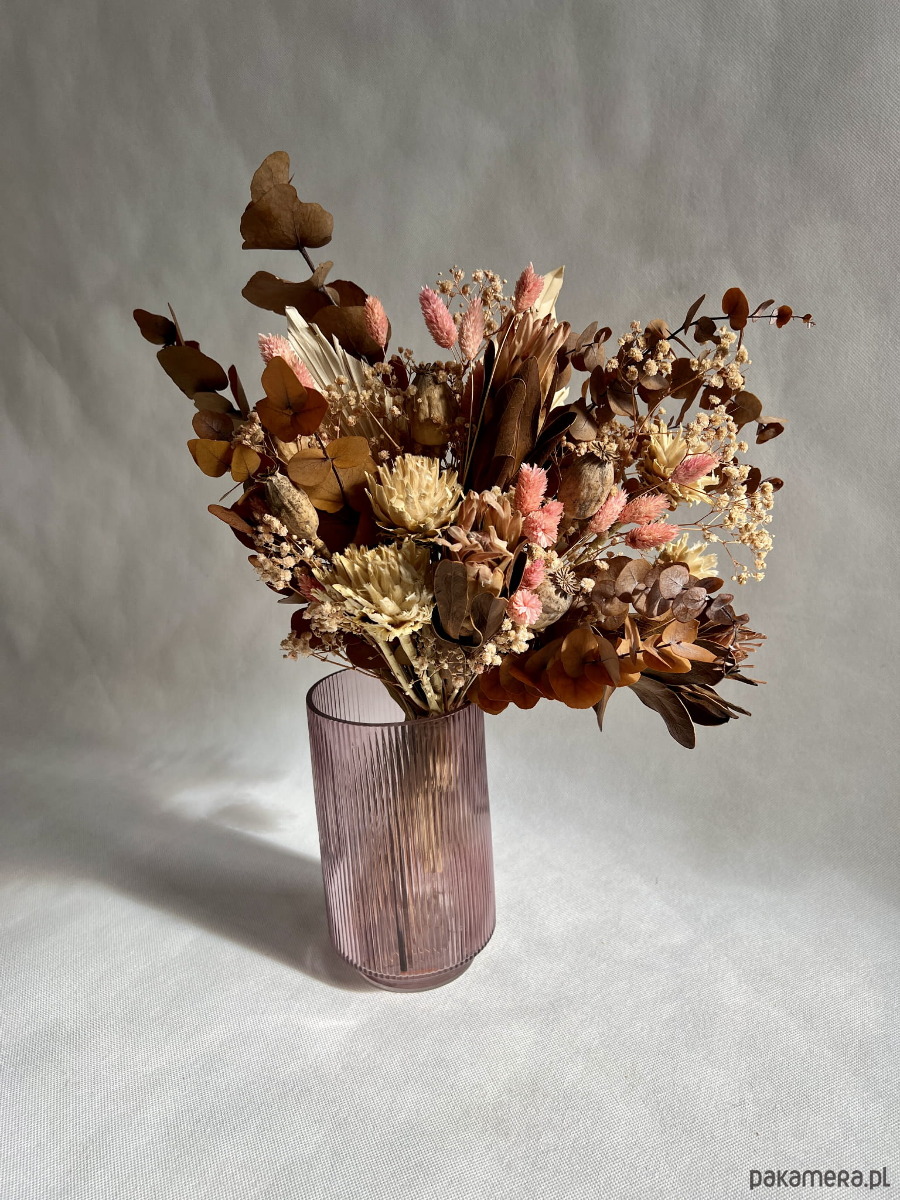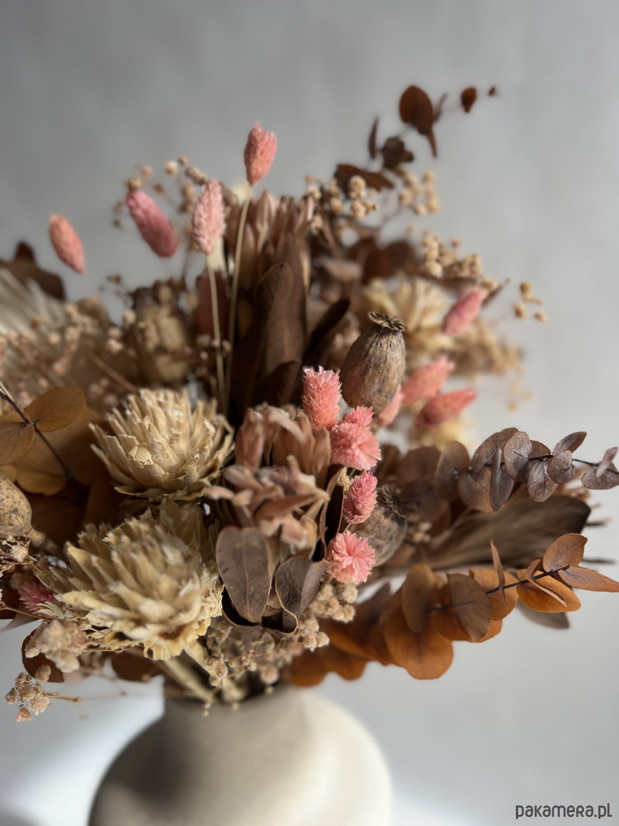 Bukiet wykonany jest z najwyższej jakości naturalnych elementów, takich jak stabilizowany eukaliptus, phalaris, protea oraz makówki. Dzięki temu bukiet ten emanuje pięknem natury i doskonale wpisuje się w naturalny styl dekoracji.
