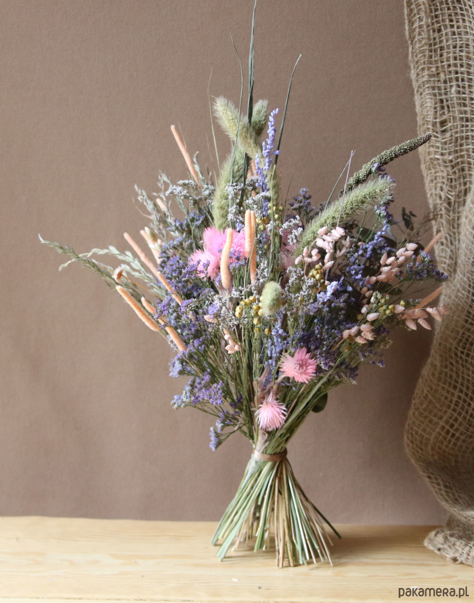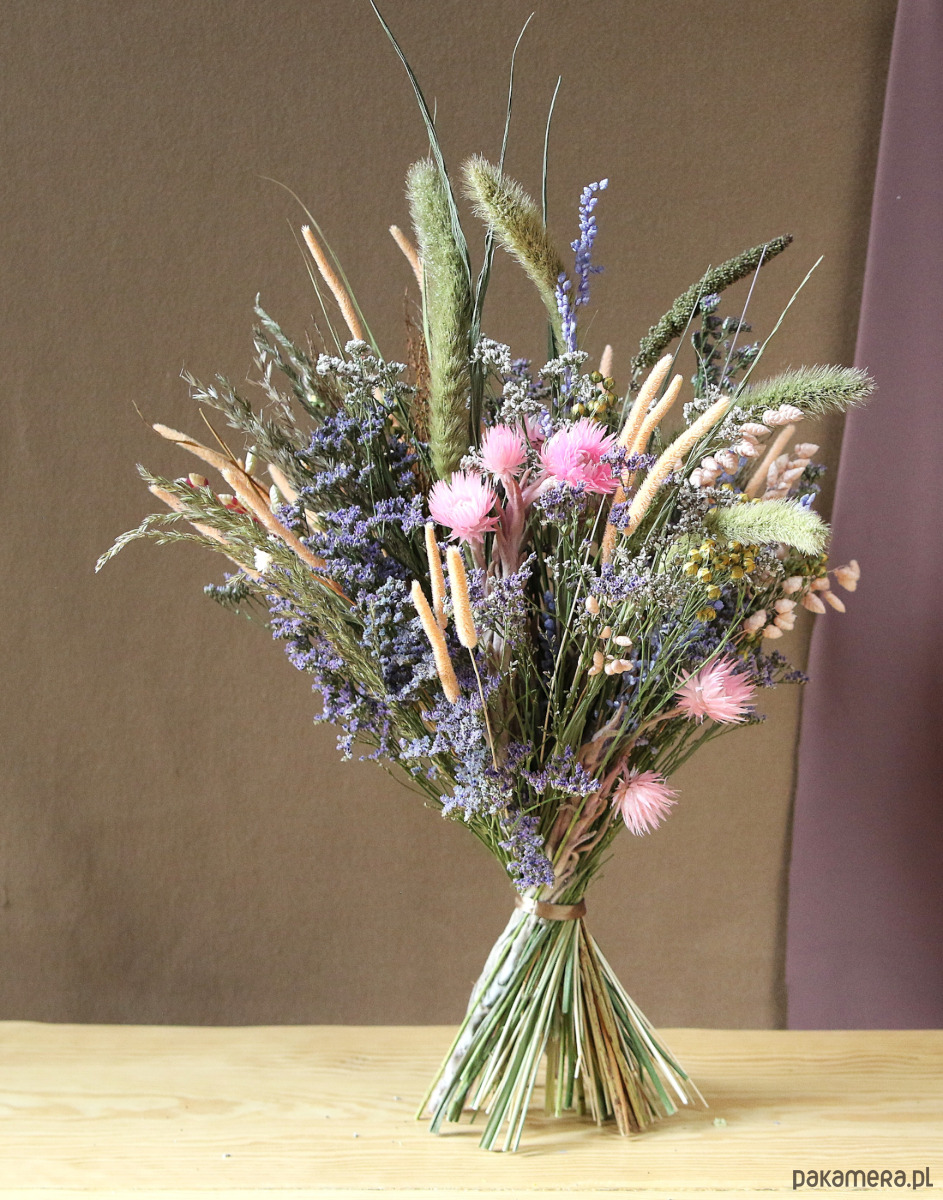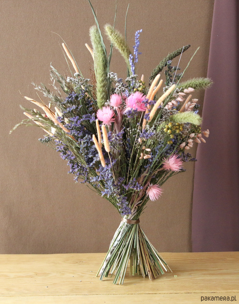 Zrobiony z suszonych i stabilizowanych kwiatów. Trwała dekoracja nie wymaga podlewania i pielęgnacji.