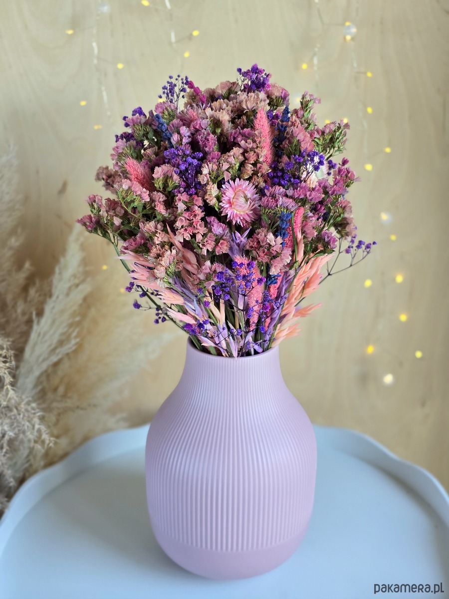 Ten bukiet to gotowy prezent i dekoracja do wnętrza. Odcienie różu i fioletu przyciągają wzrok i dodają przestrzeni koloru, a dzięki temu, że kwiaty nie więdną, zostaje z obdarowaną osobą na dłużej.