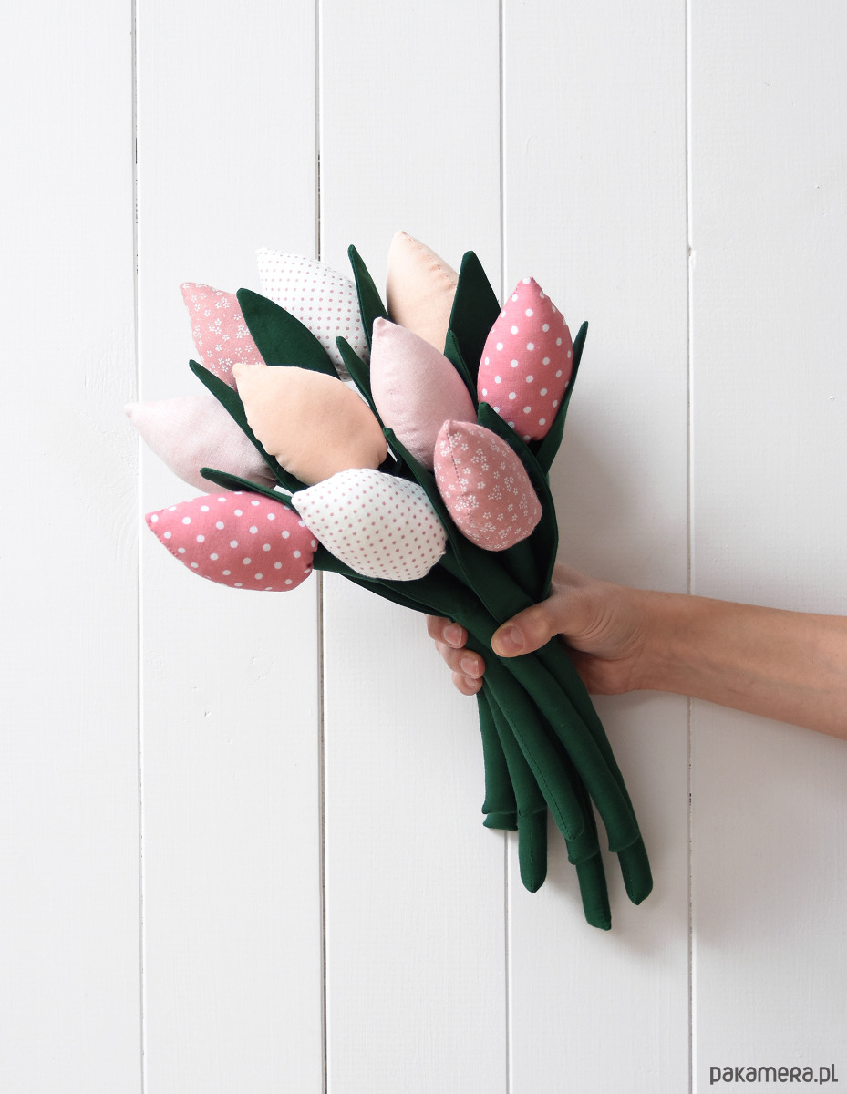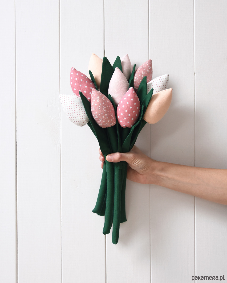 Bukiet 10 uroczych tulipanów uszytych z bawełnianych tkanin w różowym kolorze: