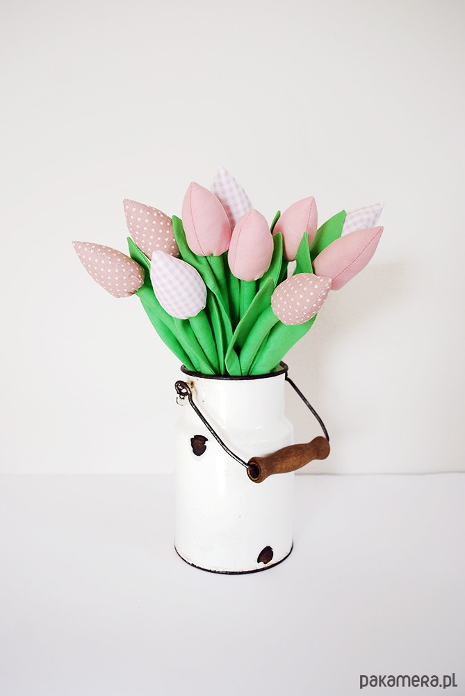 Bukiet 10 uroczych tulipanów uszytych z bawełnianych tkanin w odcieniach jasnego różu (4 gładkie, 3 w kropki, 3 w krateczkę). Tulipany zostały starannie wypełnione antyalergicznym włóknem dzięki czemu są sztywne i trzymają swój fason.