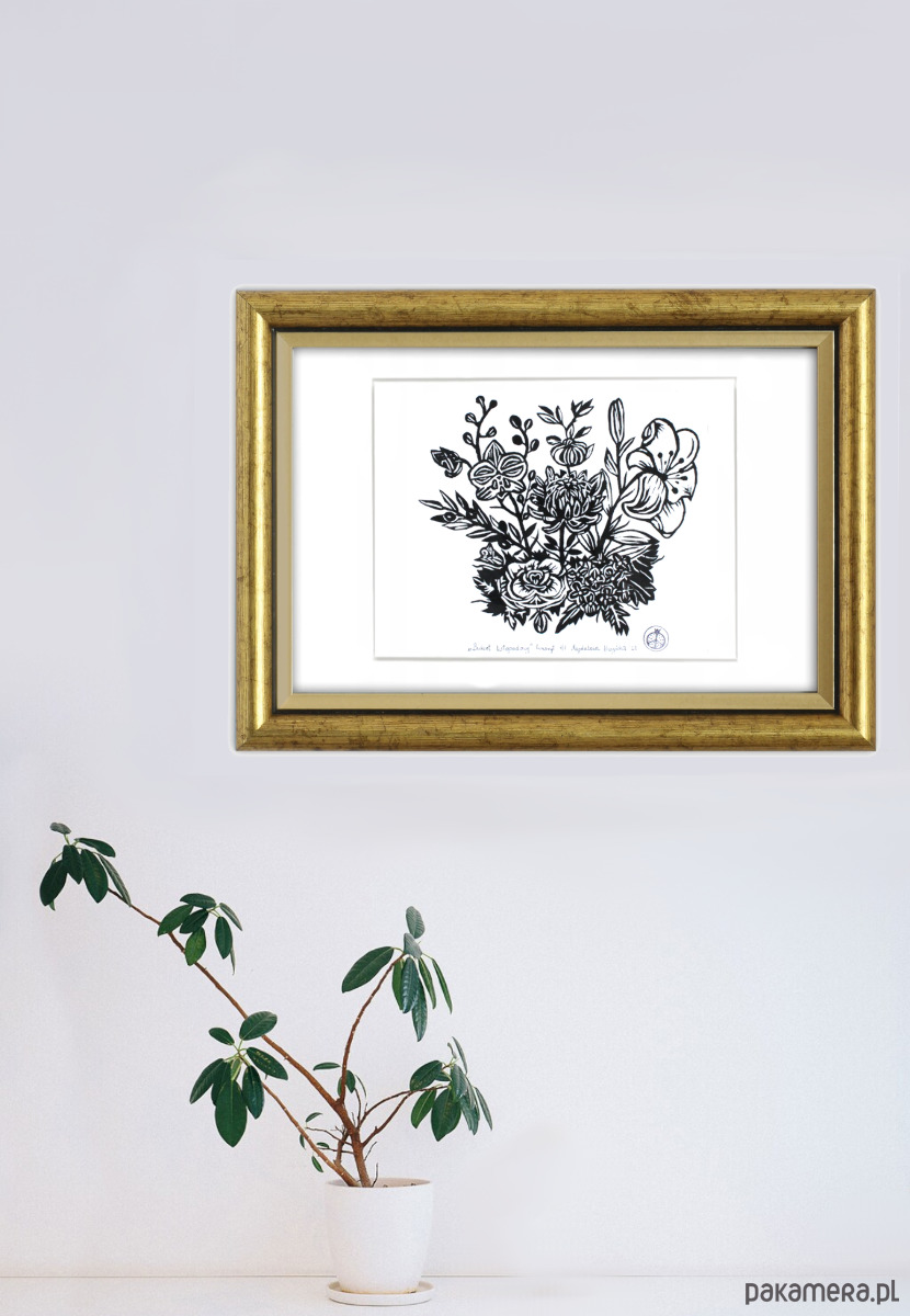 Grafika drukowana ręcznie, w technice linorytu, przedstawiająca bukiet kwiatów.