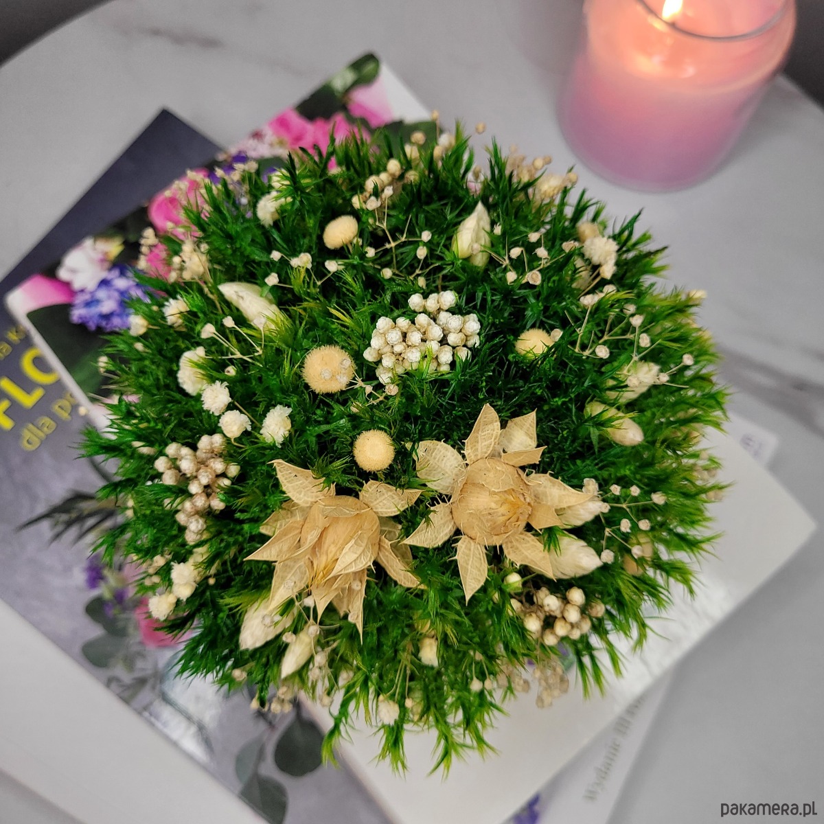 Ten bukiet to prawdziwy twórczy proces, gdzie każdy element przyjmuje swoją formę i daruje delikatną harmonię. Ten bukiet zrobiony z stabilizowanego mchu. Ozdobiony stabilizowanymi kwiatami krokusa, ryżu oraz suszonymi roślinami takimi jak botao, gipsówka.