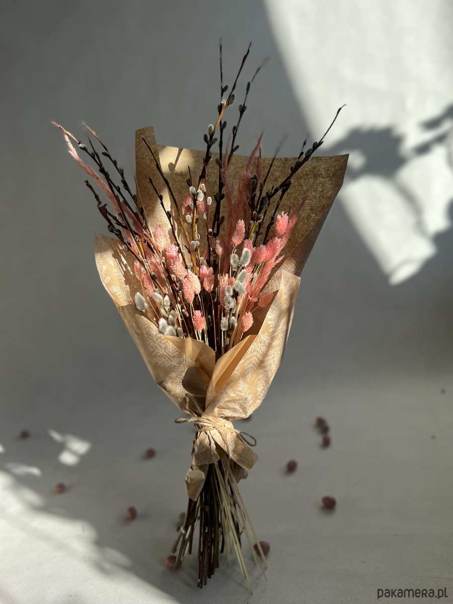 Delikatny bukiet wielkanocny stworzony z żywych bazi z suszonymi dodatkami to propozycja, która doda Twojemu domowi dużo ciepła i klasycznego świątecznego uroku.