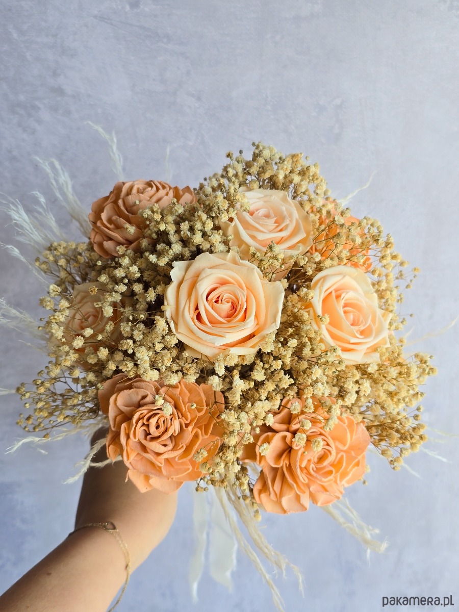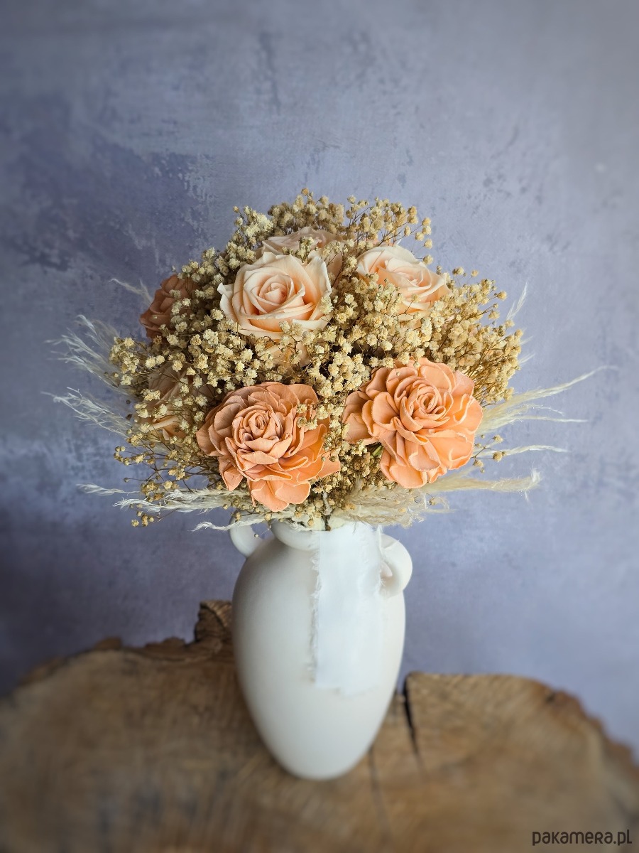 Ten bukiet wykonany ze stabilizowanych kwiatów to połączenie delikatnych róż, gipsówki i kwiatów shola w ciepłych odcieniach. Wprowadza do wnętrza spokój, subtelność i odrobinę romantyzmu - idealny dla miłośniczek naturalnych dekoracji.