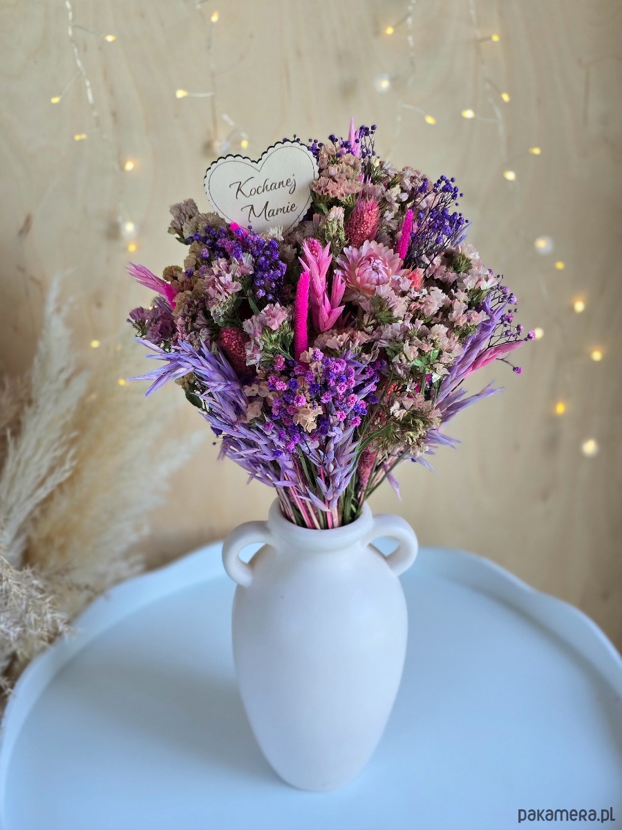 Bukiet z suszonych kwiatów na Dzień Mamy, różowo-fioletowy