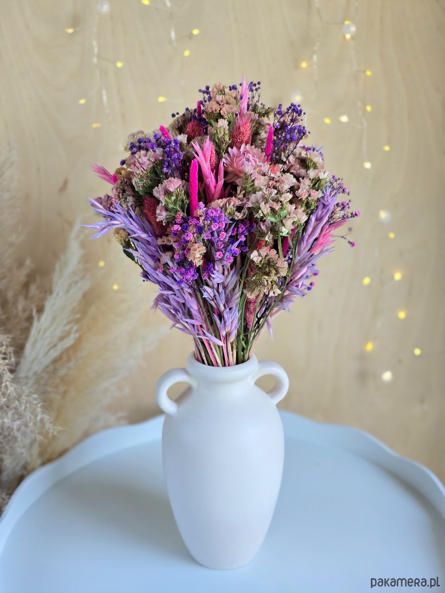 Ten bukiet to gotowy prezent i dekoracja do wnętrza. Odcienie różu i fioletu przyciągają wzrok i dodają przestrzeni koloru, a dzięki temu, że kwiaty nie więdną, zostaje z obdarowaną osobą na dłużej.