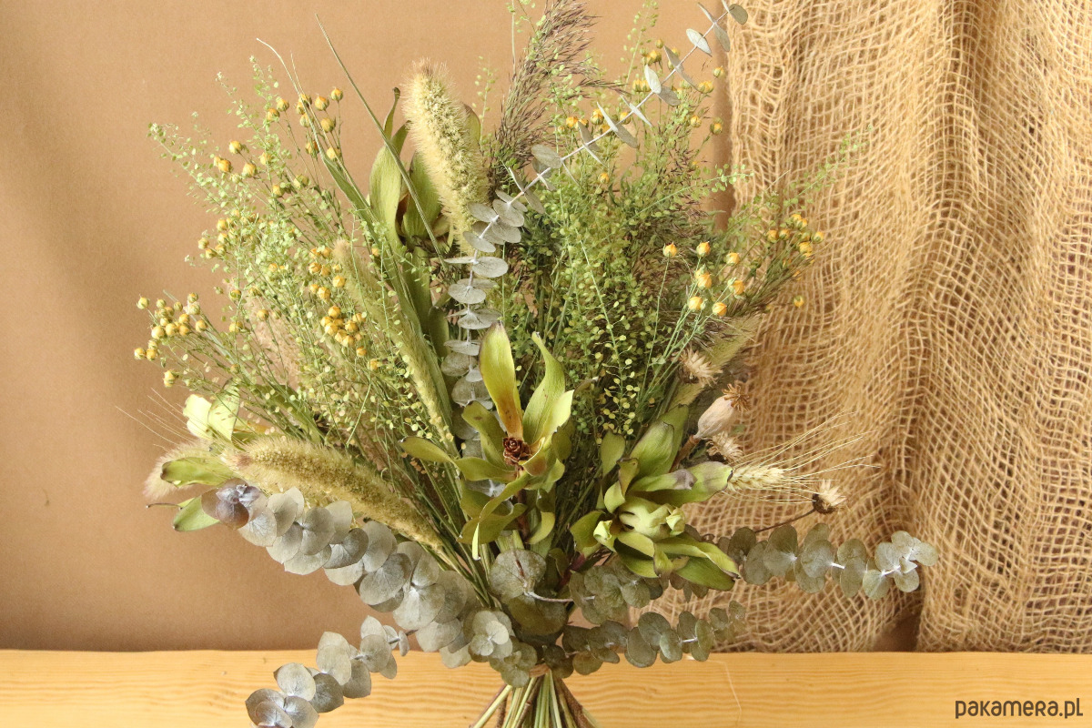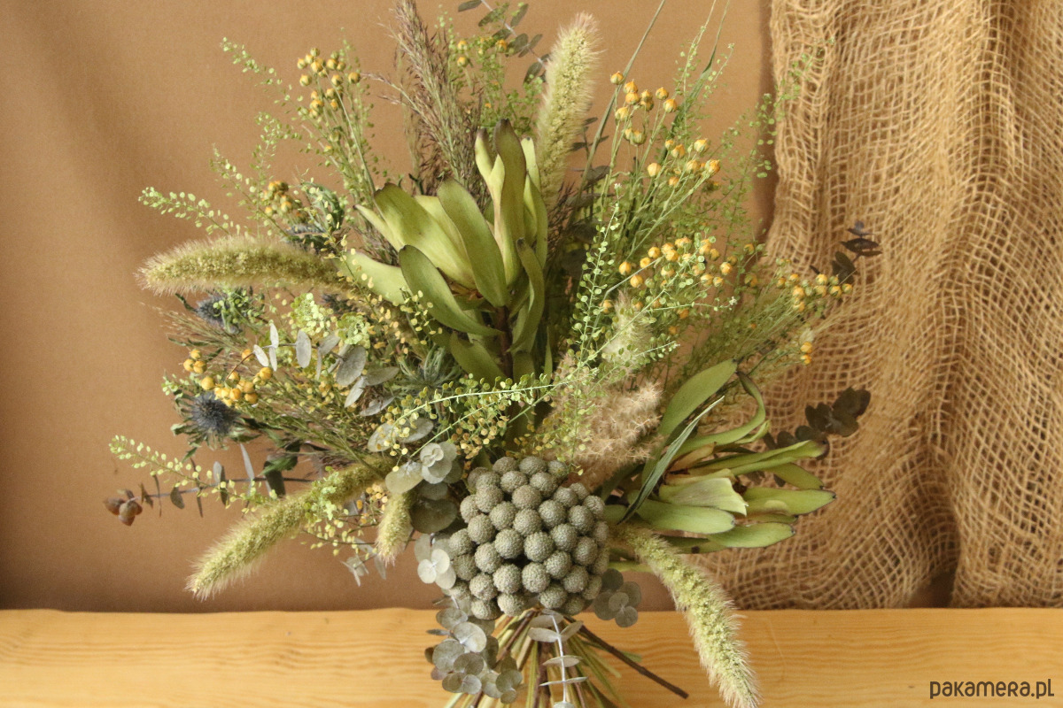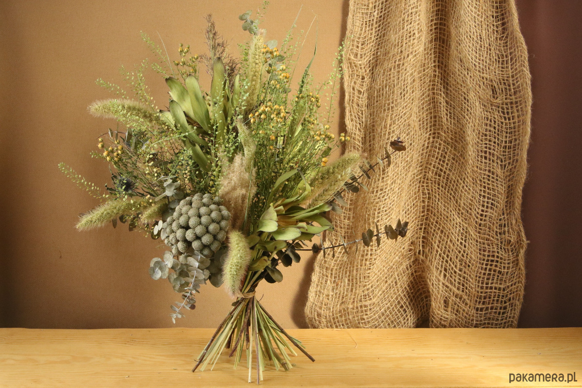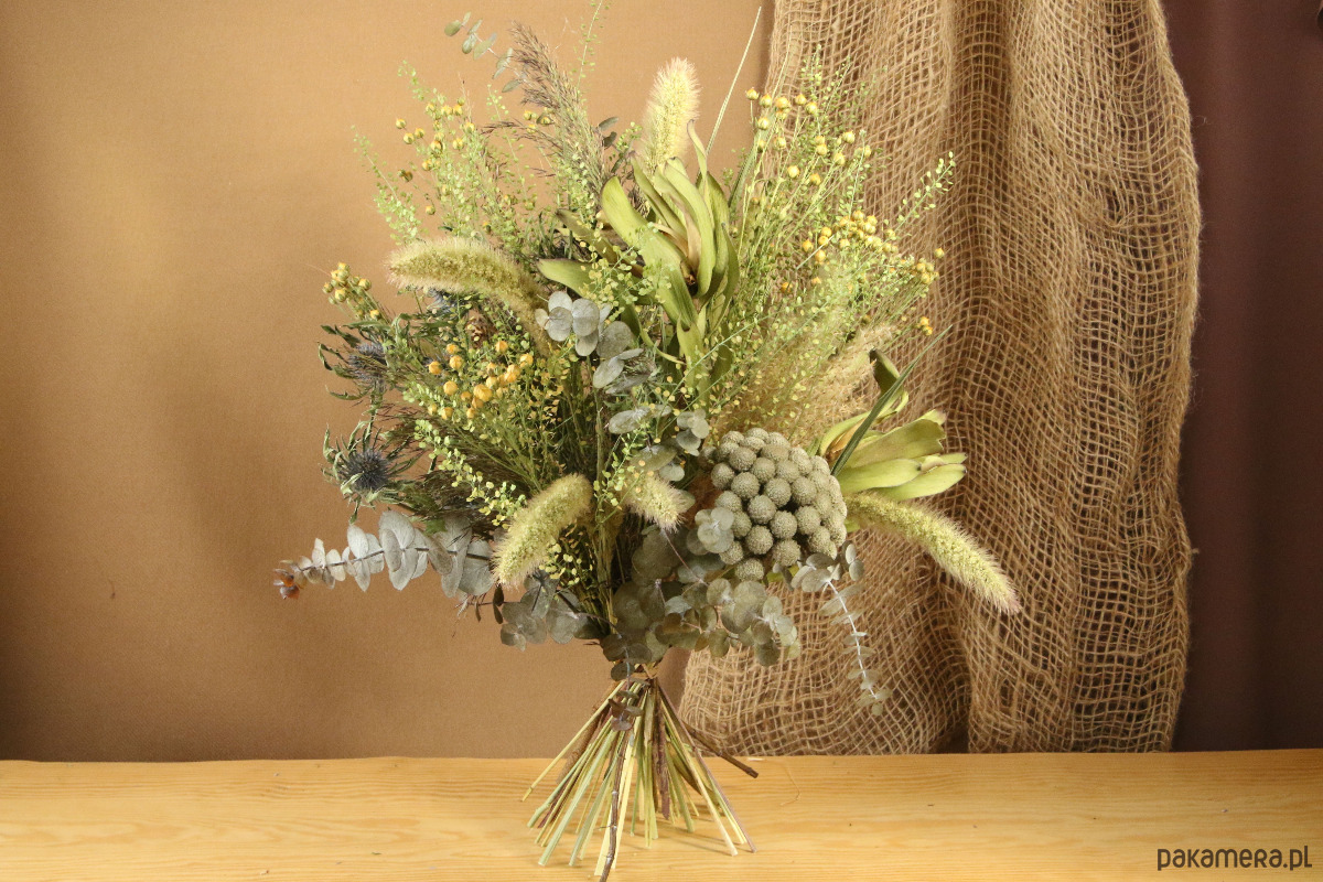 Bukiet z suszonych i stabilizowanych roślin. Duży ok 45 cm wysokości. Zielono błękitny, zawiera wiele ciekawych gatunków roślin: stabilizowany eukaliptus, brunię, lepidium, włośnicę, leukodendron. Idealny na prezent.