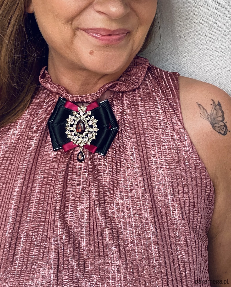 Broszka wykonana z wysokiej jakości taśm i dodatków. Brosza w kolorze burgundu i czerni. Na środku imponująca ażurowa ozdoba biżuteryjna z kryształami w kolorze wina. Brosza stworzona z myślą o kobietach delikatnych o klasycznej urodzie. Będzie idealnie pasować zarówno do koszul, bluzek, swetrów, sukienek, żakietów oraz do płaszczy, kurtek, szali i chust. Idealna do każdej stylizacji, zarówno do sportowej jak również do eleganckich stylizacji.