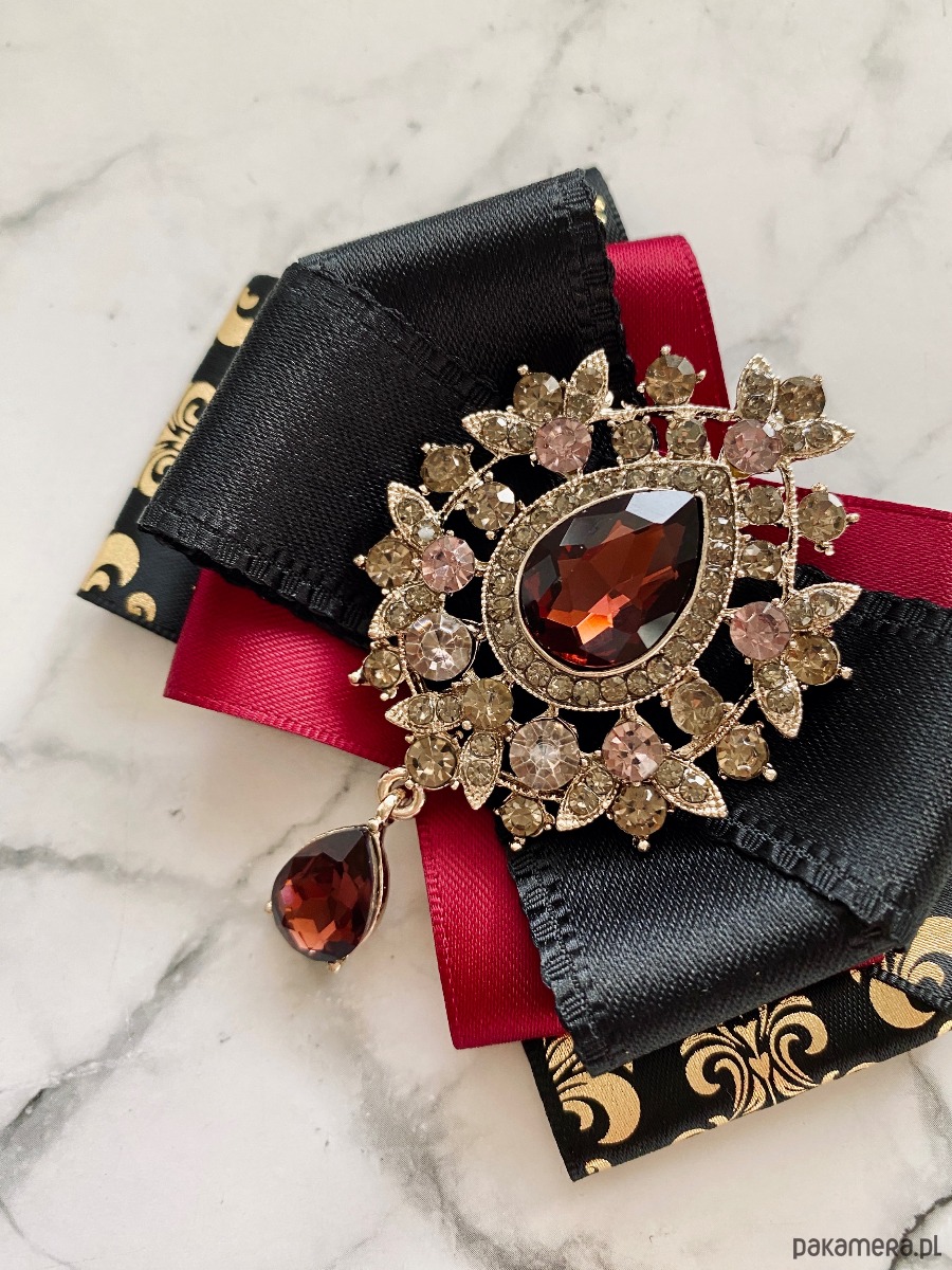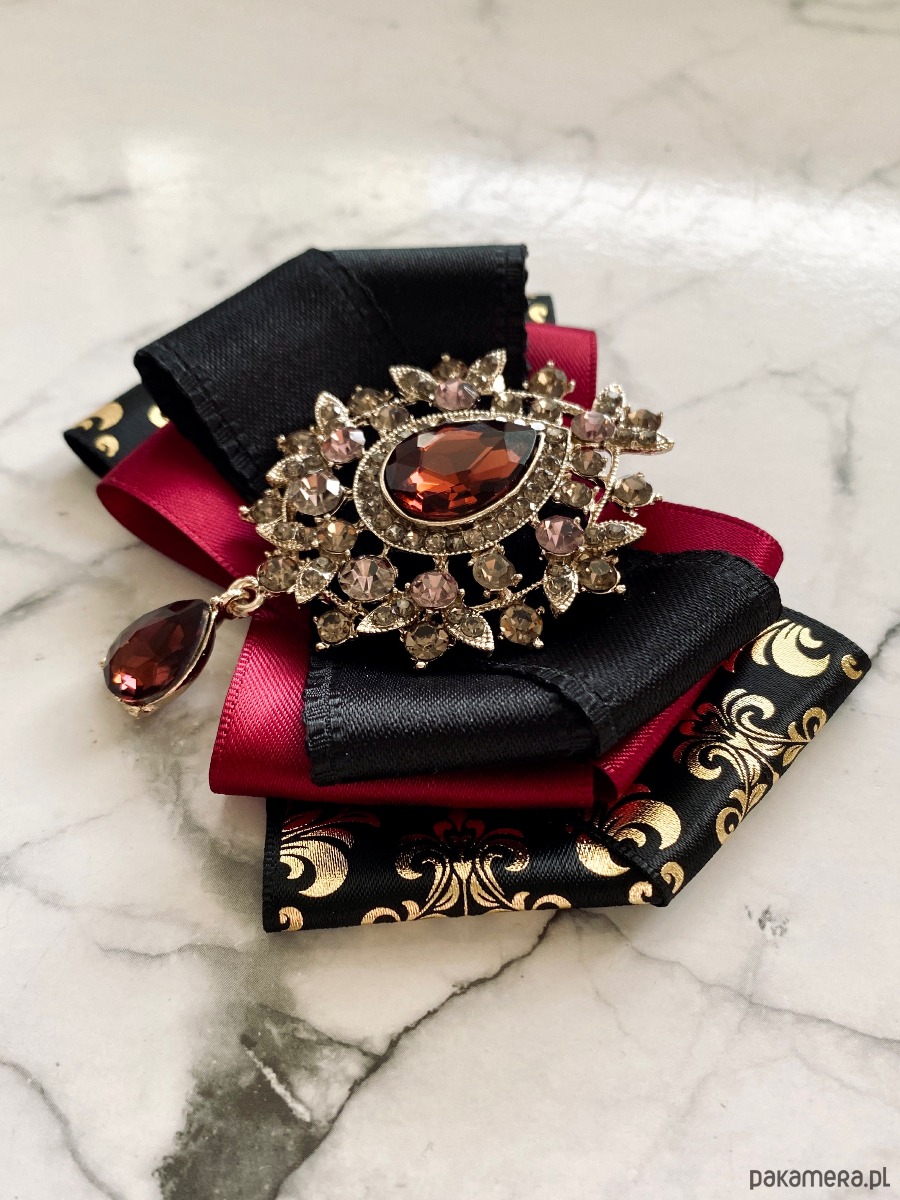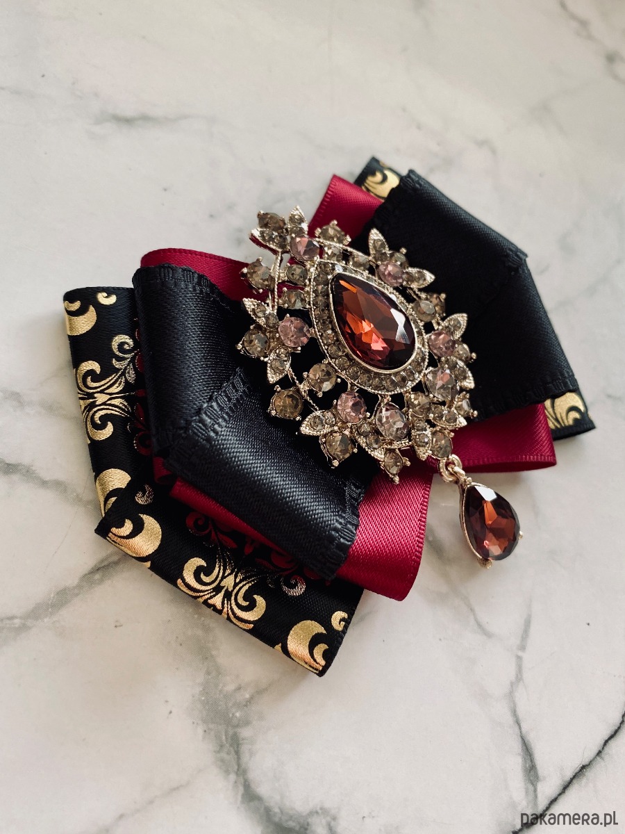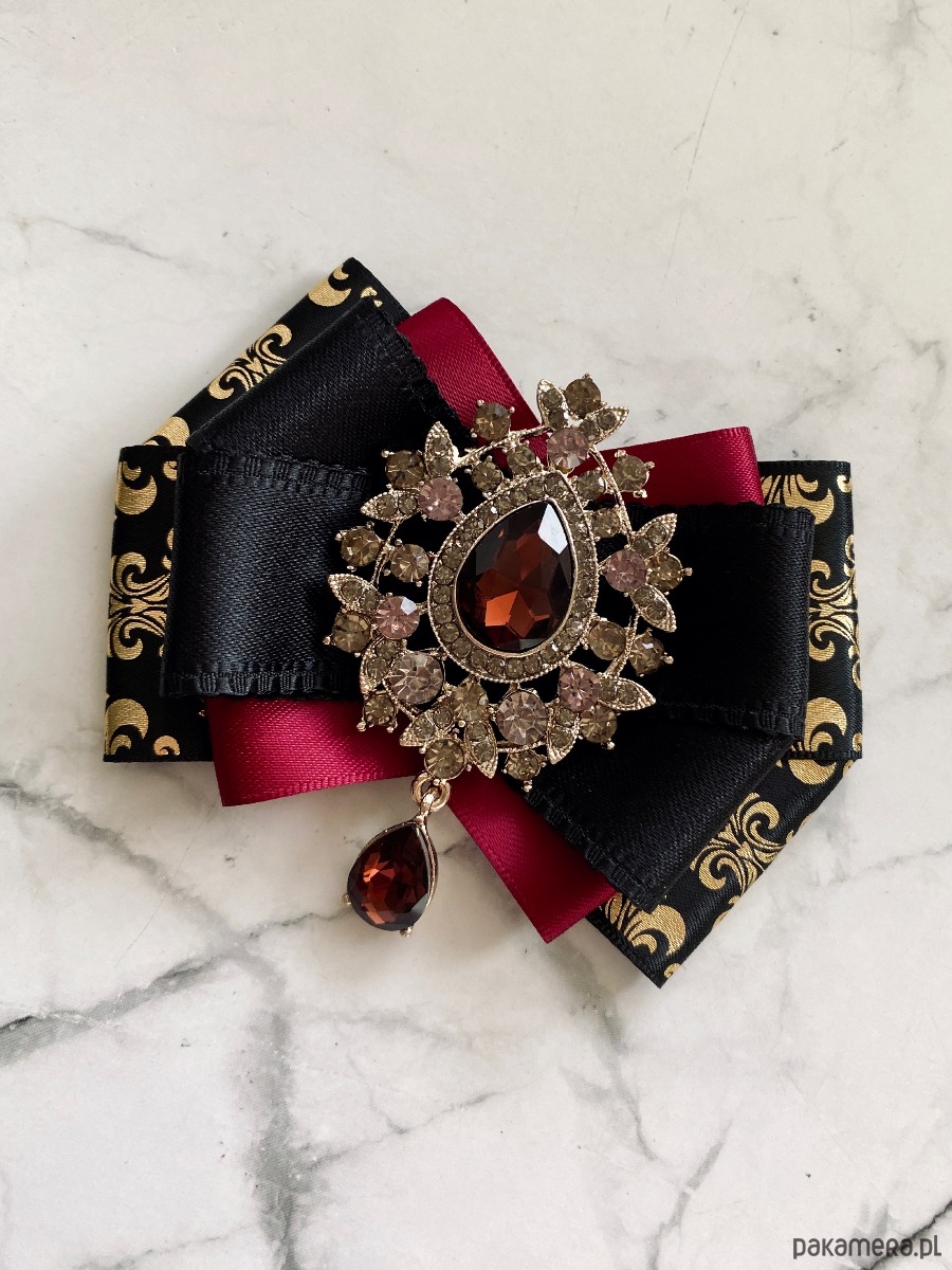 Broszka wykonana z wysokiej jakości taśm i dodatków. Brosza w kolorze burgundu, czerni i złota. Na środku imponująca ażurowa ozdoba biżuteryjna z kryształami w kolorze wina. Brosza stworzona z myślą o kobietach delikatnych o klasycznej urodzie. Będzie idealnie pasować zarówno do koszul, bluzek, swetrów, sukienek, żakietów oraz do płaszczy, kurtek, szali i chust. Idealna do każdej stylizacji, zarówno do sportowej jak również do eleganckich stylizacji.