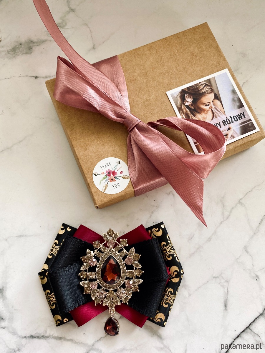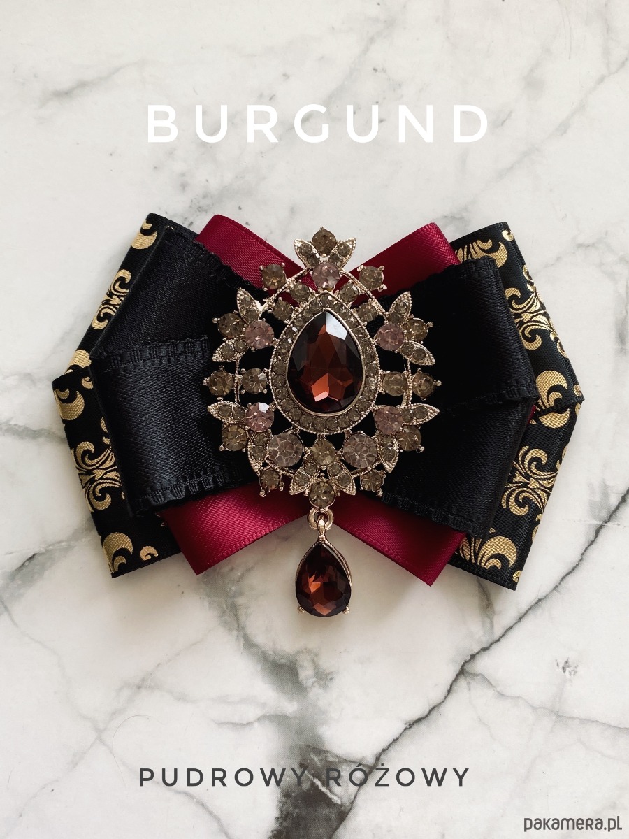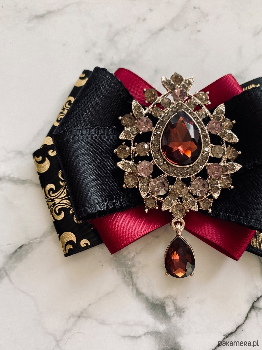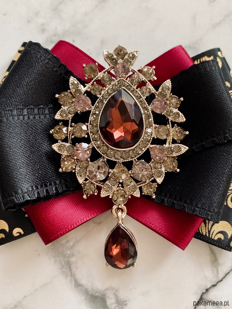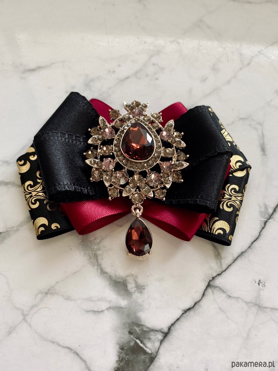 Broszka wykonana z wysokiej jakości taśm i dodatków. Brosza w kolorze burgundu, czerni i złota. Na środku imponująca ażurowa ozdoba biżuteryjna z kryształami w kolorze wina. Brosza stworzona z myślą o kobietach delikatnych o klasycznej urodzie. Będzie idealnie pasować zarówno do koszul, bluzek, swetrów, sukienek, żakietów oraz do płaszczy, kurtek, szali i chust. Idealna do każdej stylizacji, zarówno do sportowej jak również do eleganckich stylizacji.