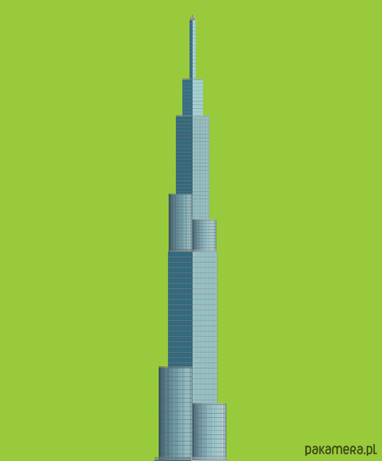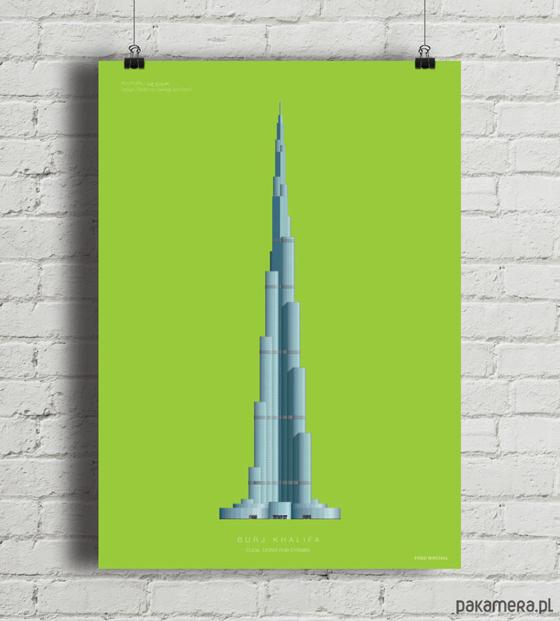 Plakat z autorską grafiką inspirowany Burj Khalifa w Dubaju. Pochodzi z serii "Dookoła Świata" i przedstawia liczący 828 najwyższy budynek świata. Wieżowiec zaprojektowany został przez przedsiębiorstwo architektoniczne Skidmore, Owings, Merrill.