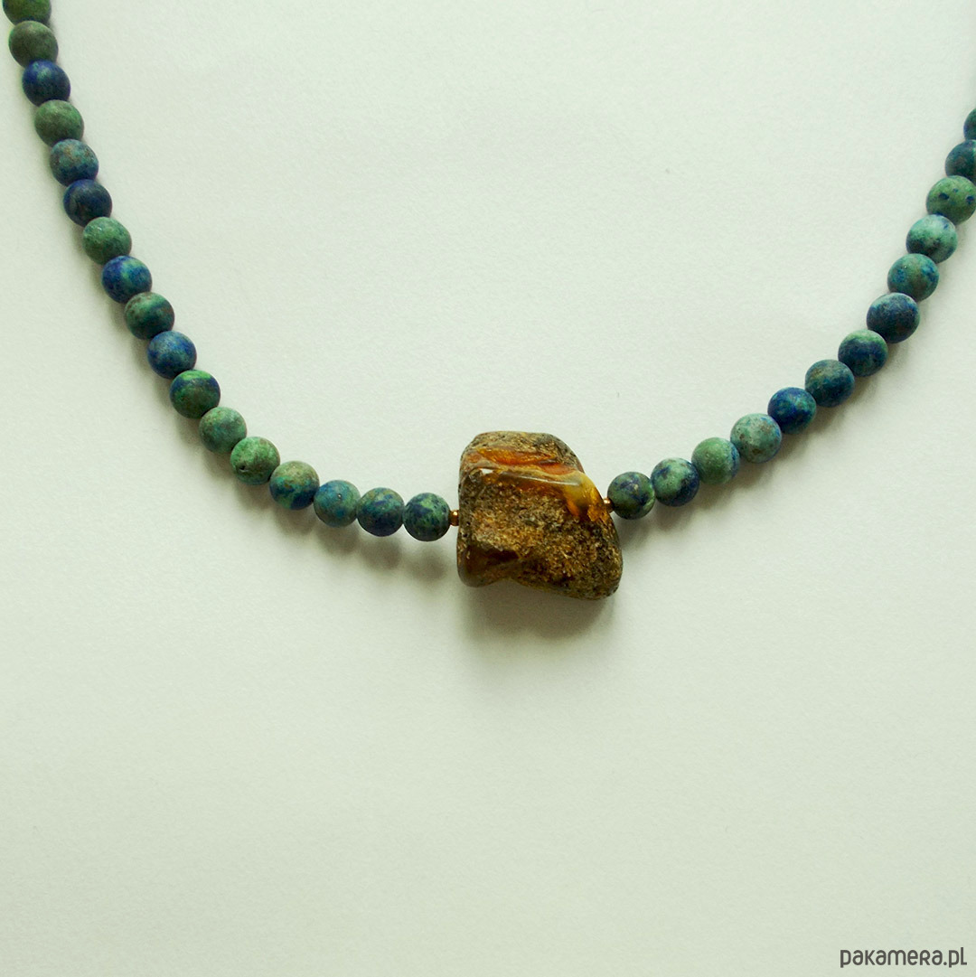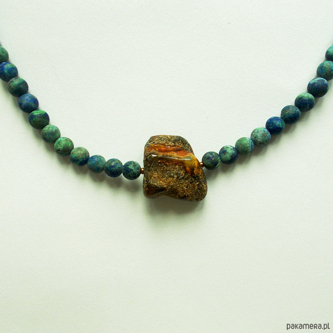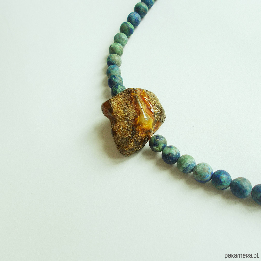 Naszyjnik z kamieniami chryzokoli i wyjątkowym okazem bursztynu bałtyckiego
