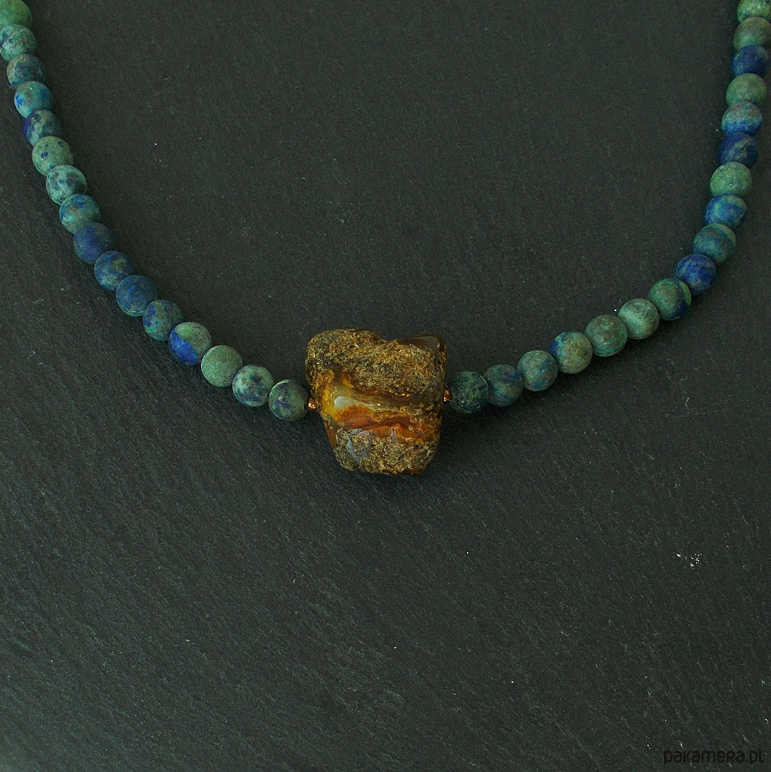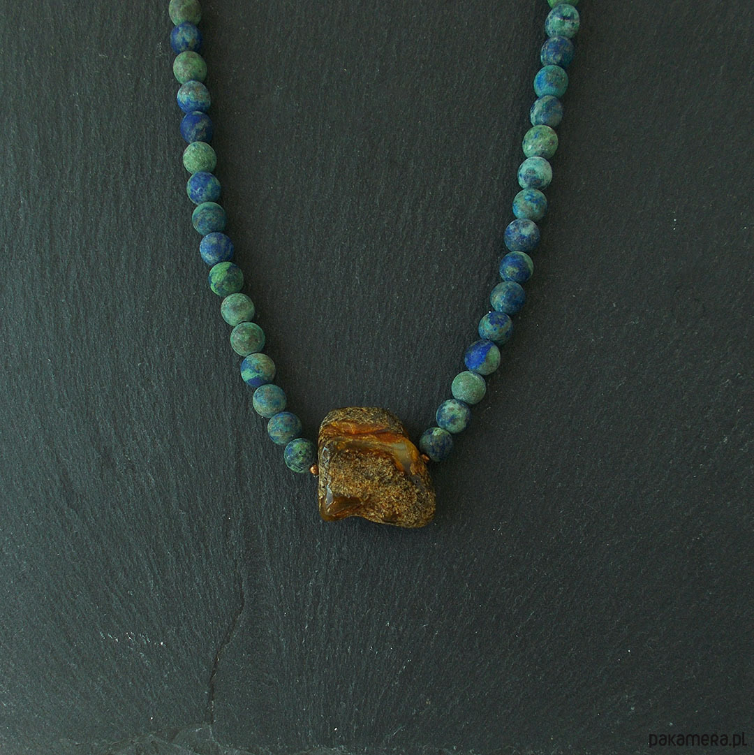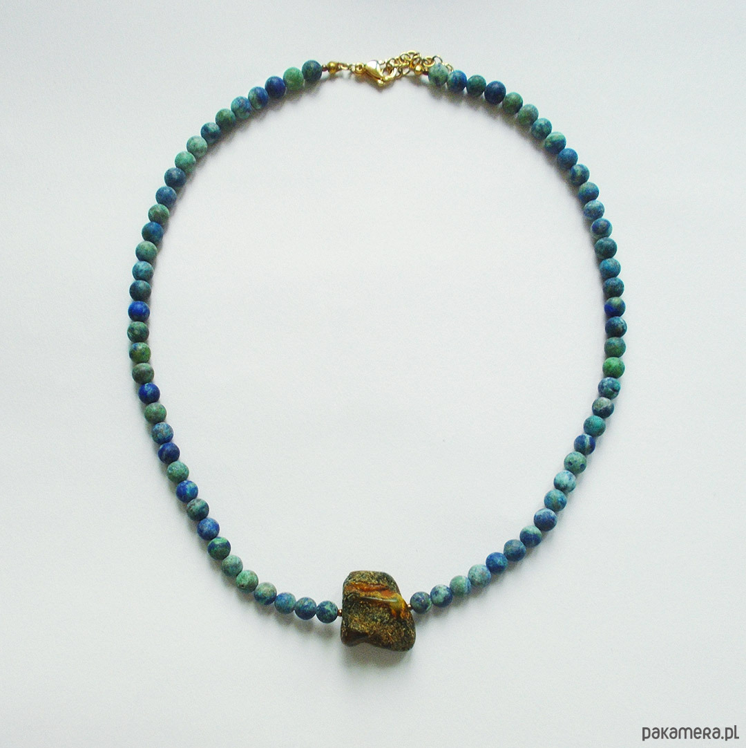 Naszyjnik z kamieniami chryzokoli i wyjątkowym okazem bursztynu bałtyckiego