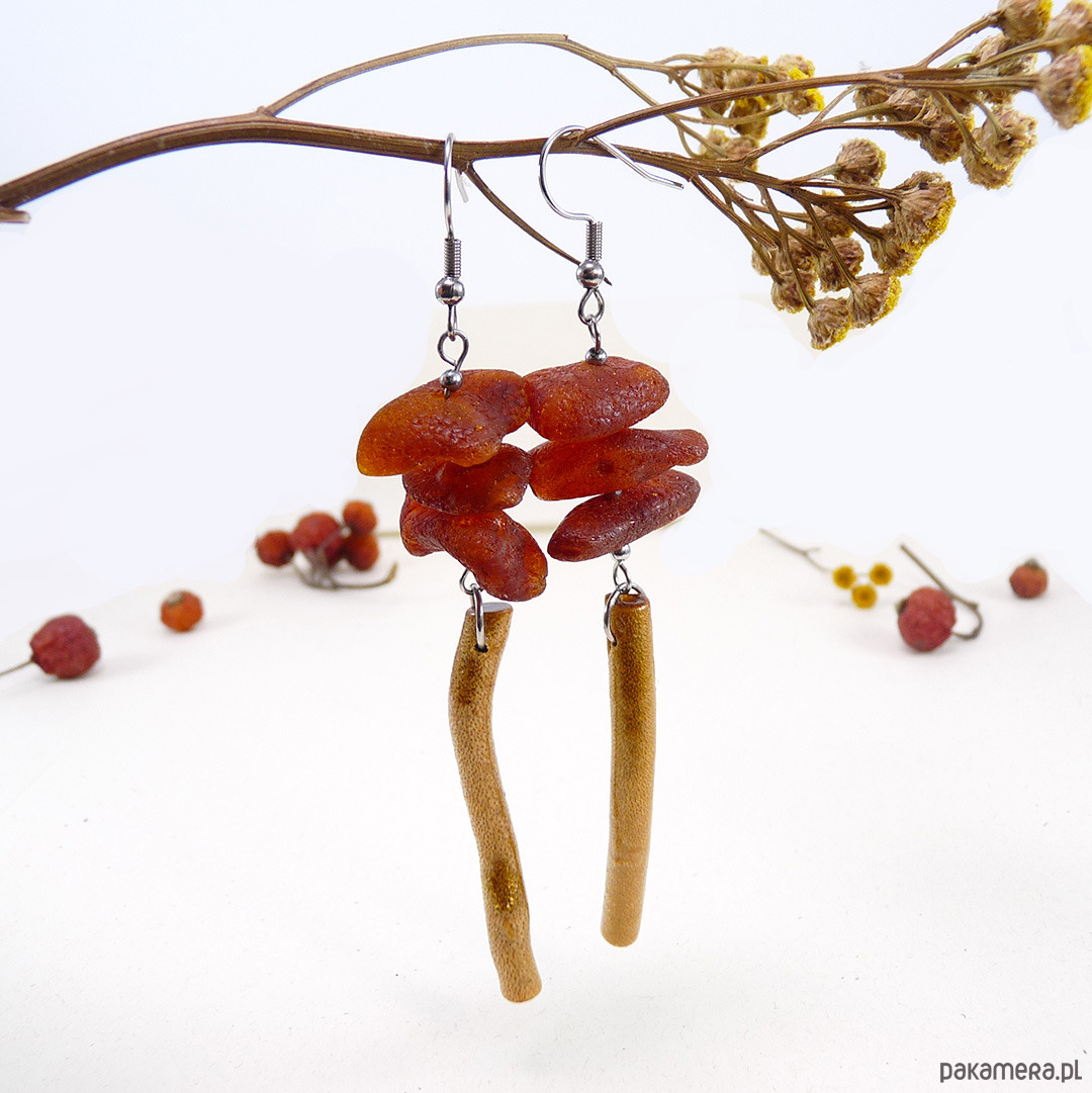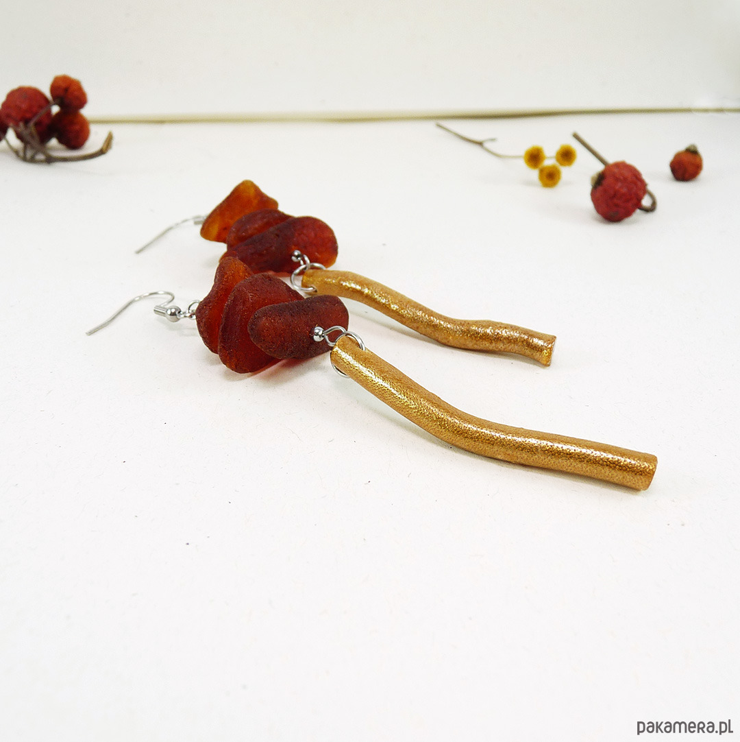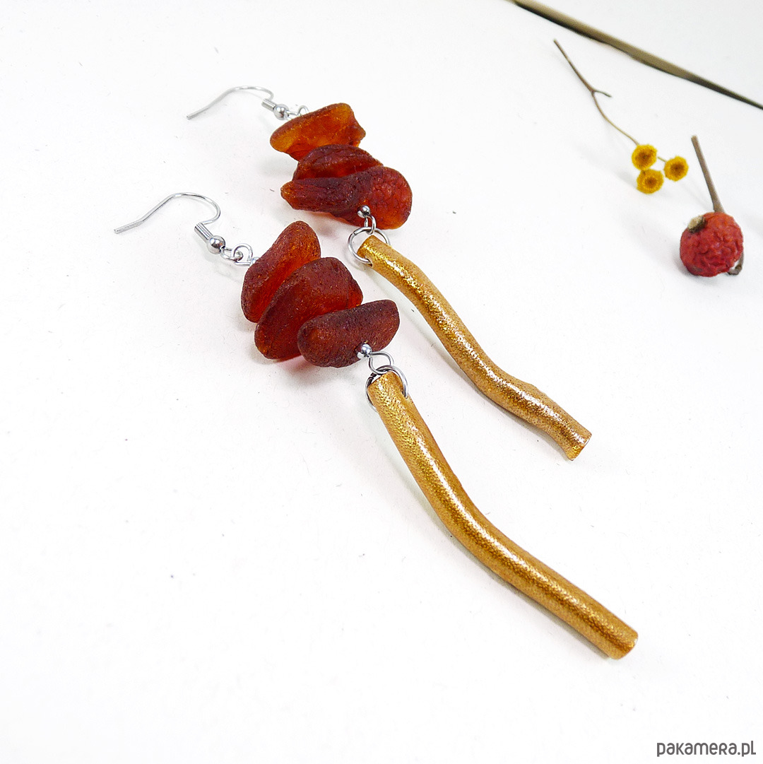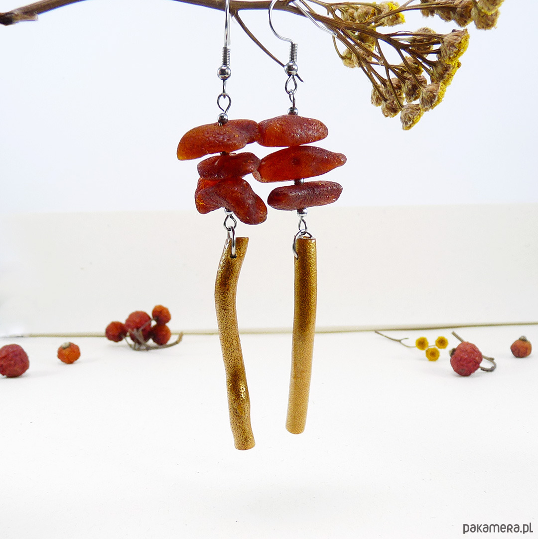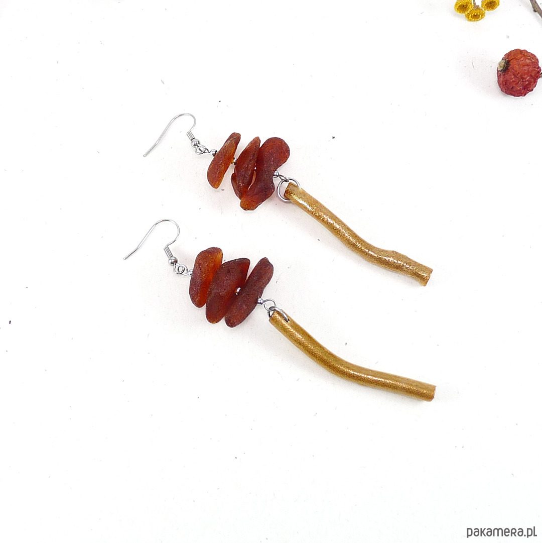 matowy bursztyn bałtycki 16-25 mm, koral złoty patyczek 5 cm, stal szlachetna srebrna ( bigle i pozostałe dodatki metalowe)