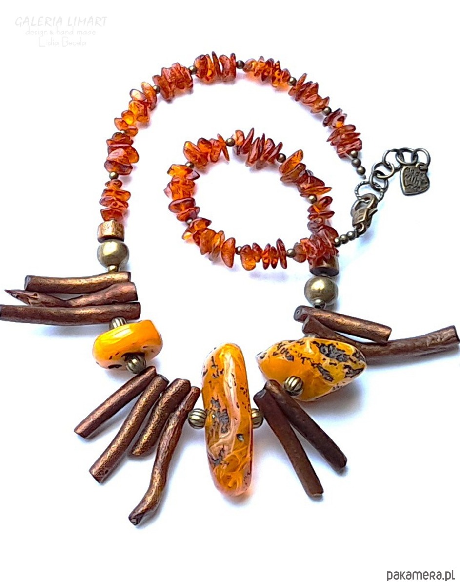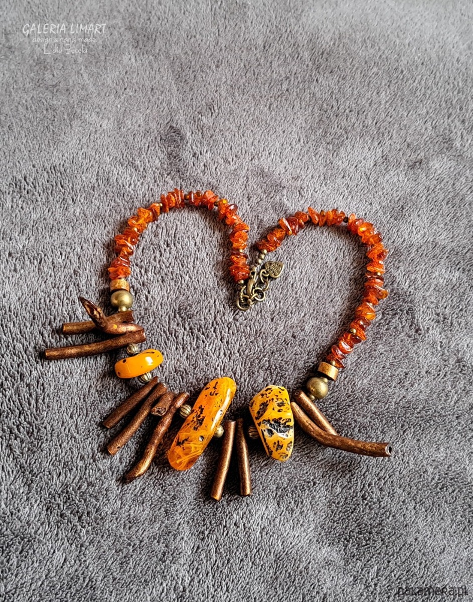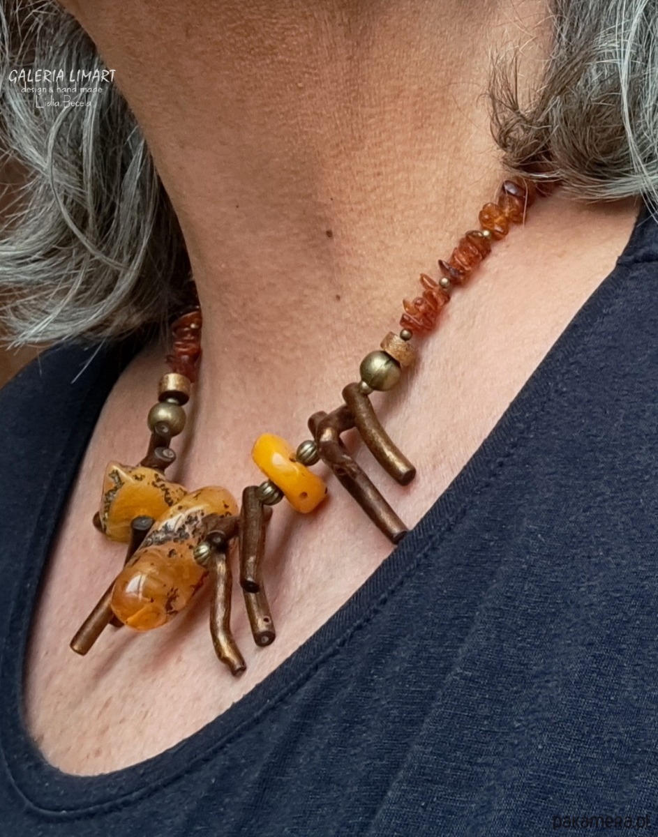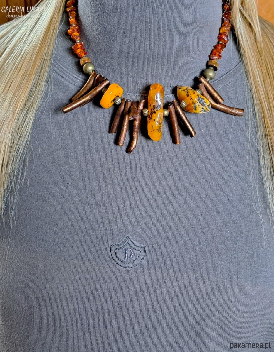 Moja niezmiernie efektowna i elegancka kompozycja naszyjnika z 3 wielkich surowych bursztynów meksykański zwany copal. Copal to naturalna żywica pochodząca z Meksyku. Wytworzyły ją drzewa z rodzaju Burseraceae, lecz wydobywana jest spod ziemi, gdyż właściwie jest to żywiczna skamielina, forma przejściowa pomiędzy żywicą a bursztynem. W tym naszyjniku ciekawe okazy copal'a zostały przeplecione gałązkami naturalnego złotego korala i ozdobami z mosiądzu, rewelacyjnie komponującego się z copalem, tworząc perfekcyjną kompozycję kolorystyczną. Przy szyi naszyjnik z drobnych bursztynów bałtyckich. Długość ok. 45 cm + łańcuszek regulacyjny.