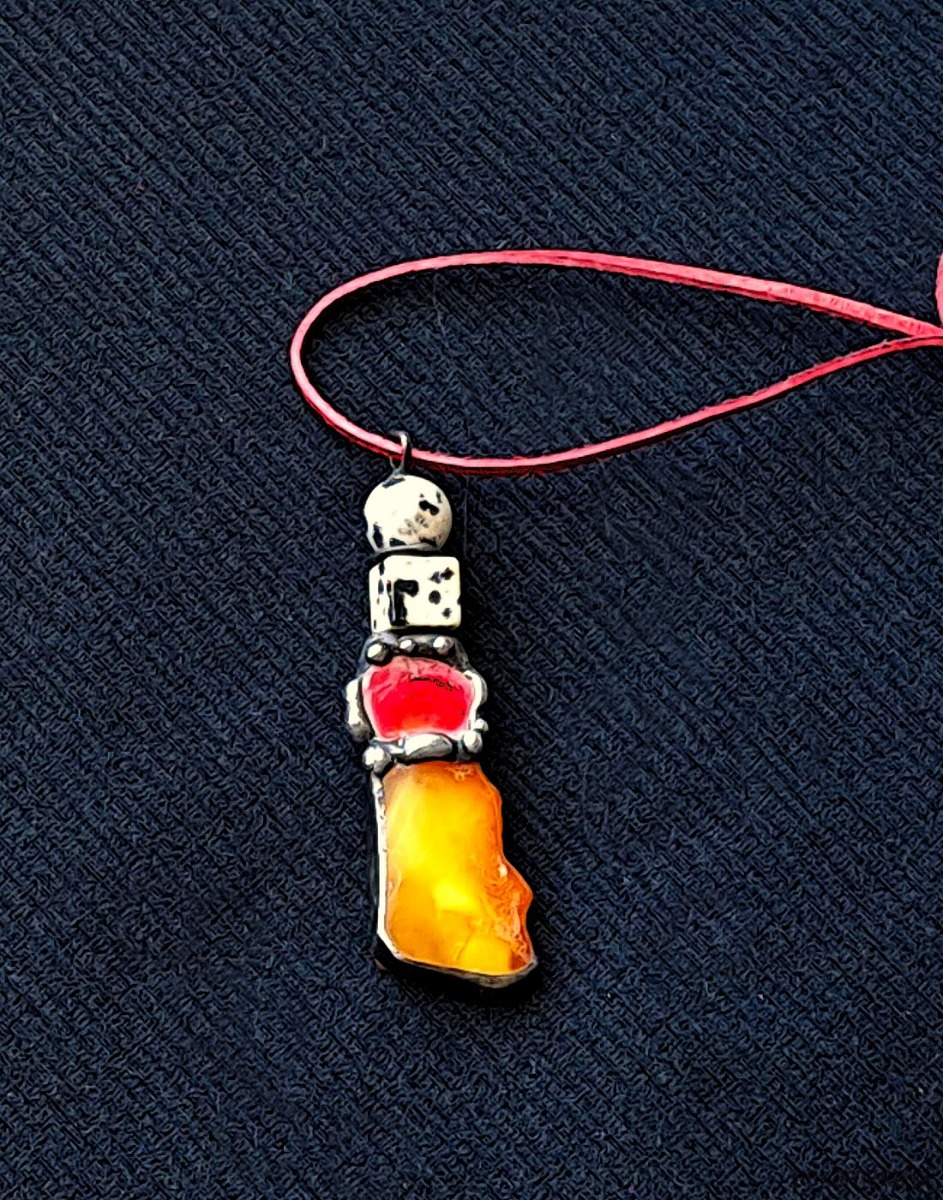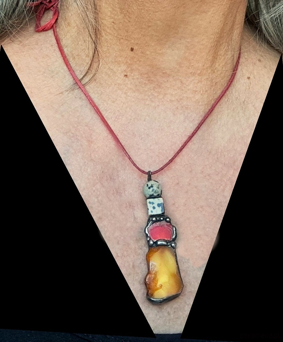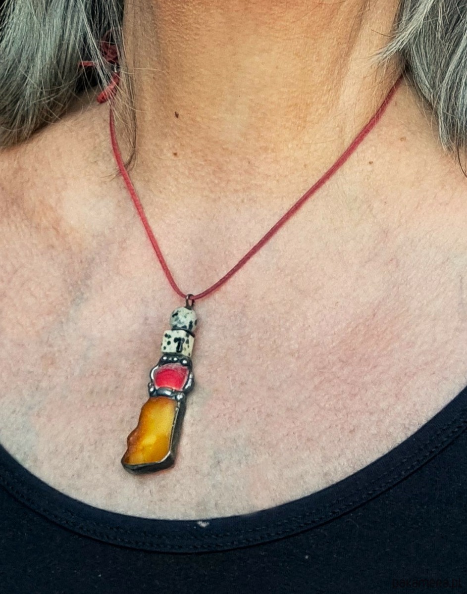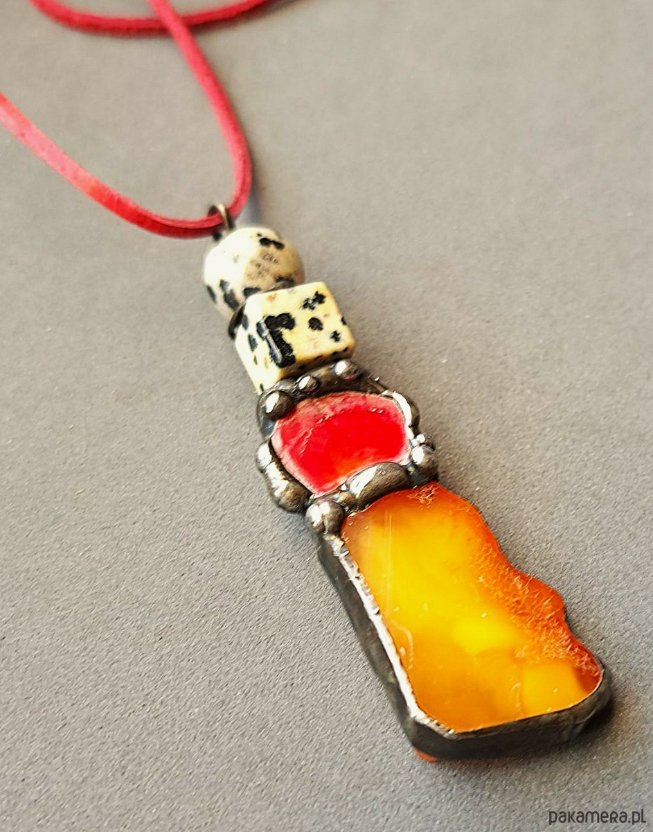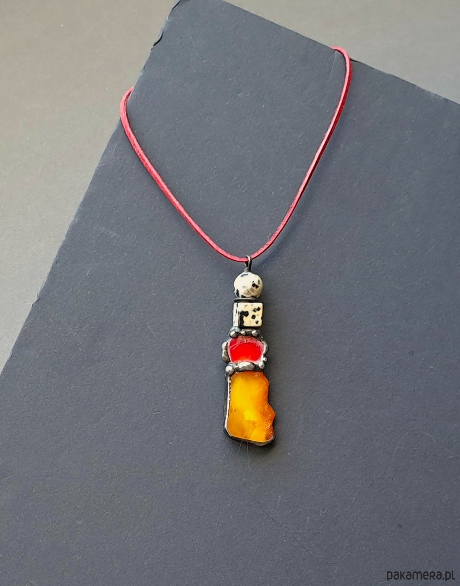 Bursztyn, jaspis dalmatyński i koral w wisiorku handmade prezent z klasą
