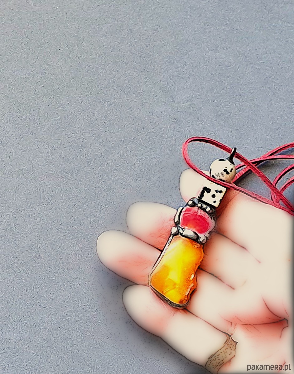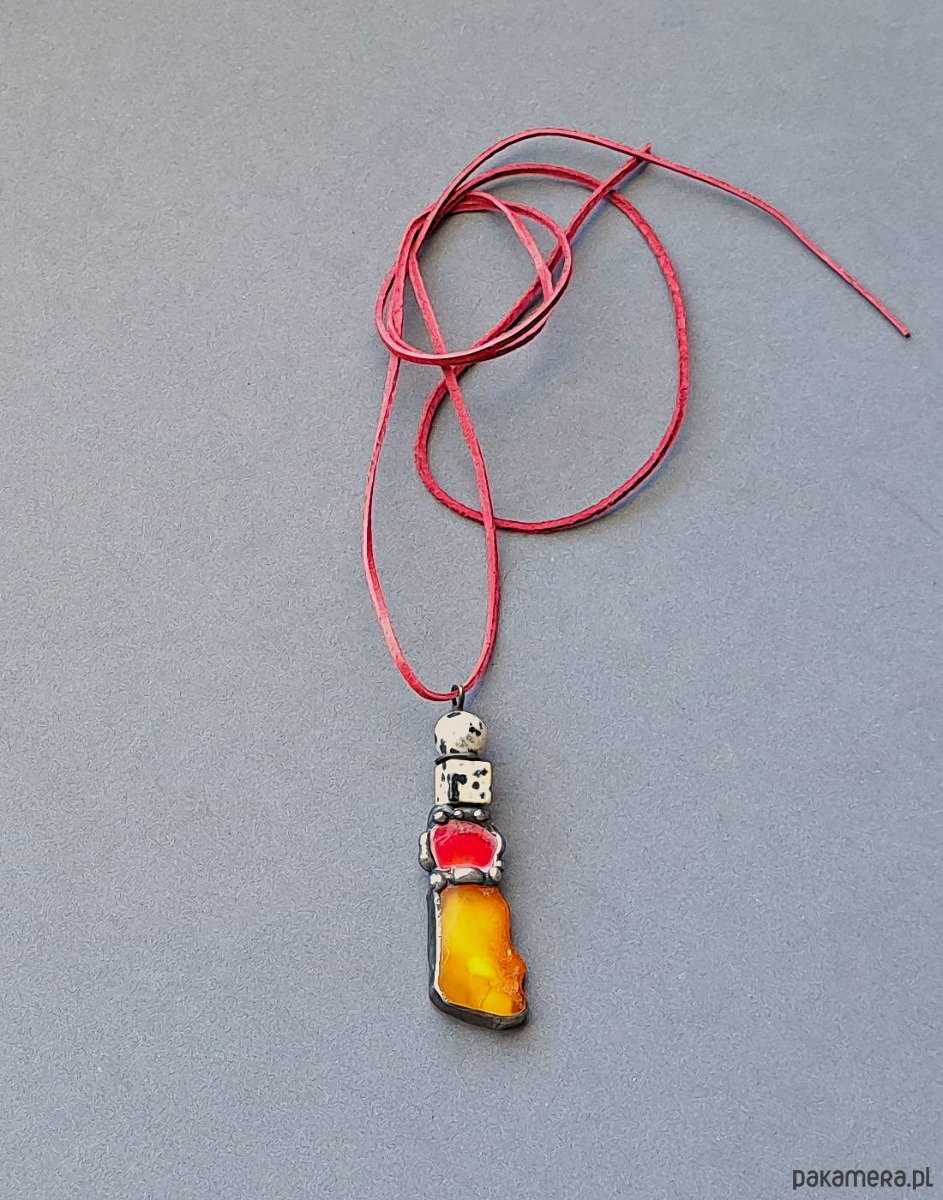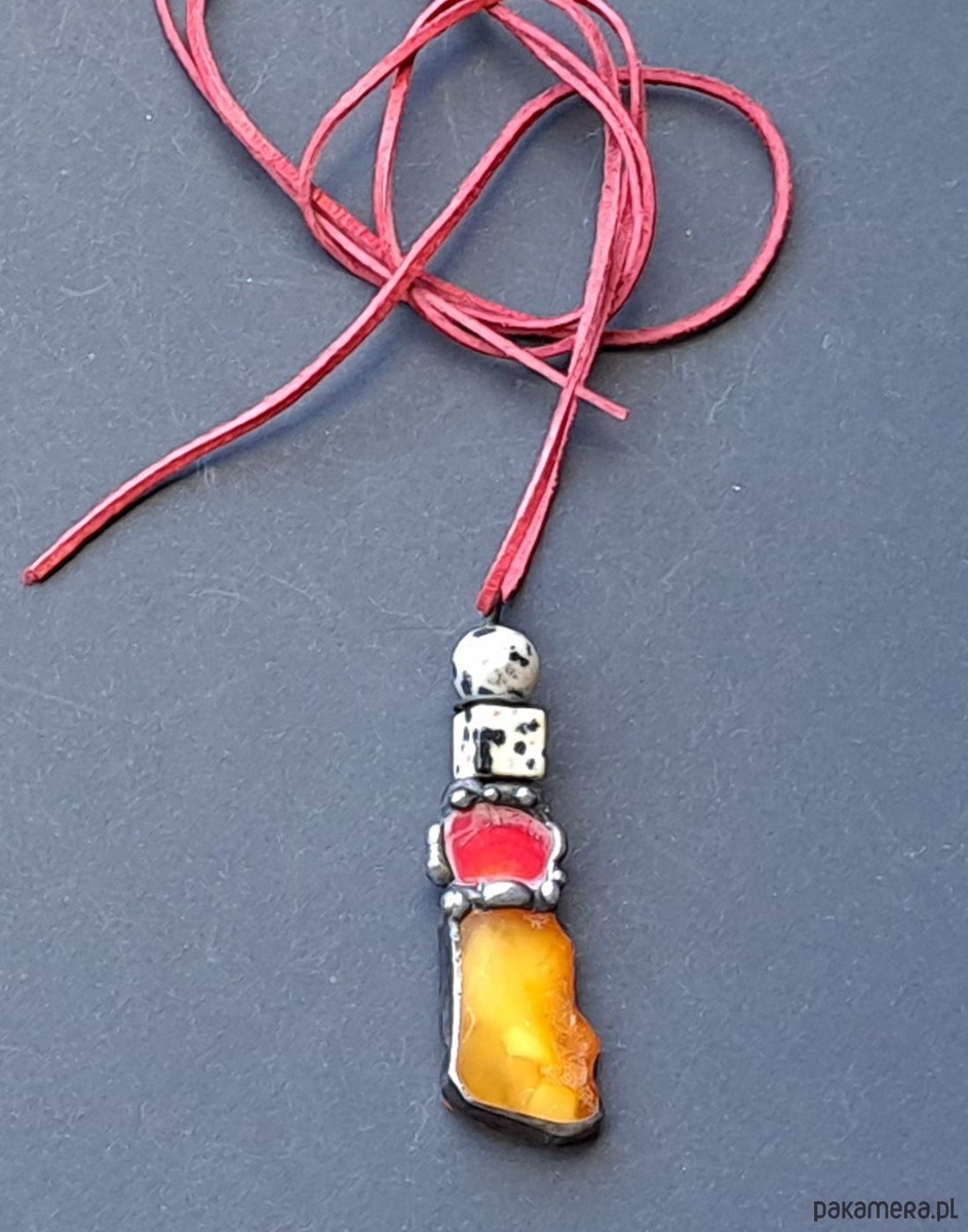 Autorski unikalny wisior z nieregularnym pięknie ubarwionym mlecznym bursztynem bałtyckim, jaspisem dalmatyńskim i naturalnym koralem. Wisiorek (ok 7 cm) został zawieszony na surowym naturalnym rzemyku ze skóry (GRATIS!), dzięki specjalnemu zawiązaniu można regulować długość wisiorka.