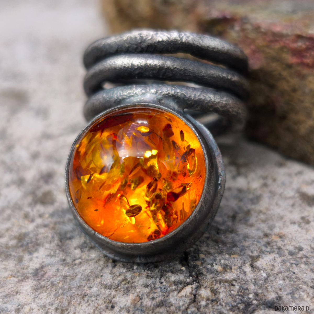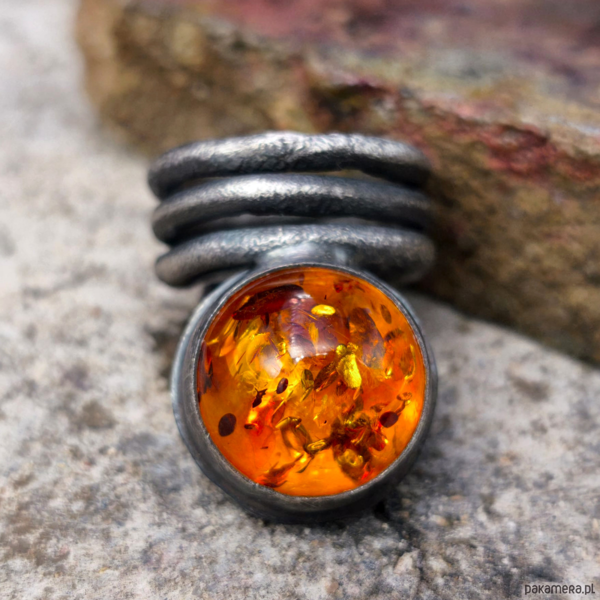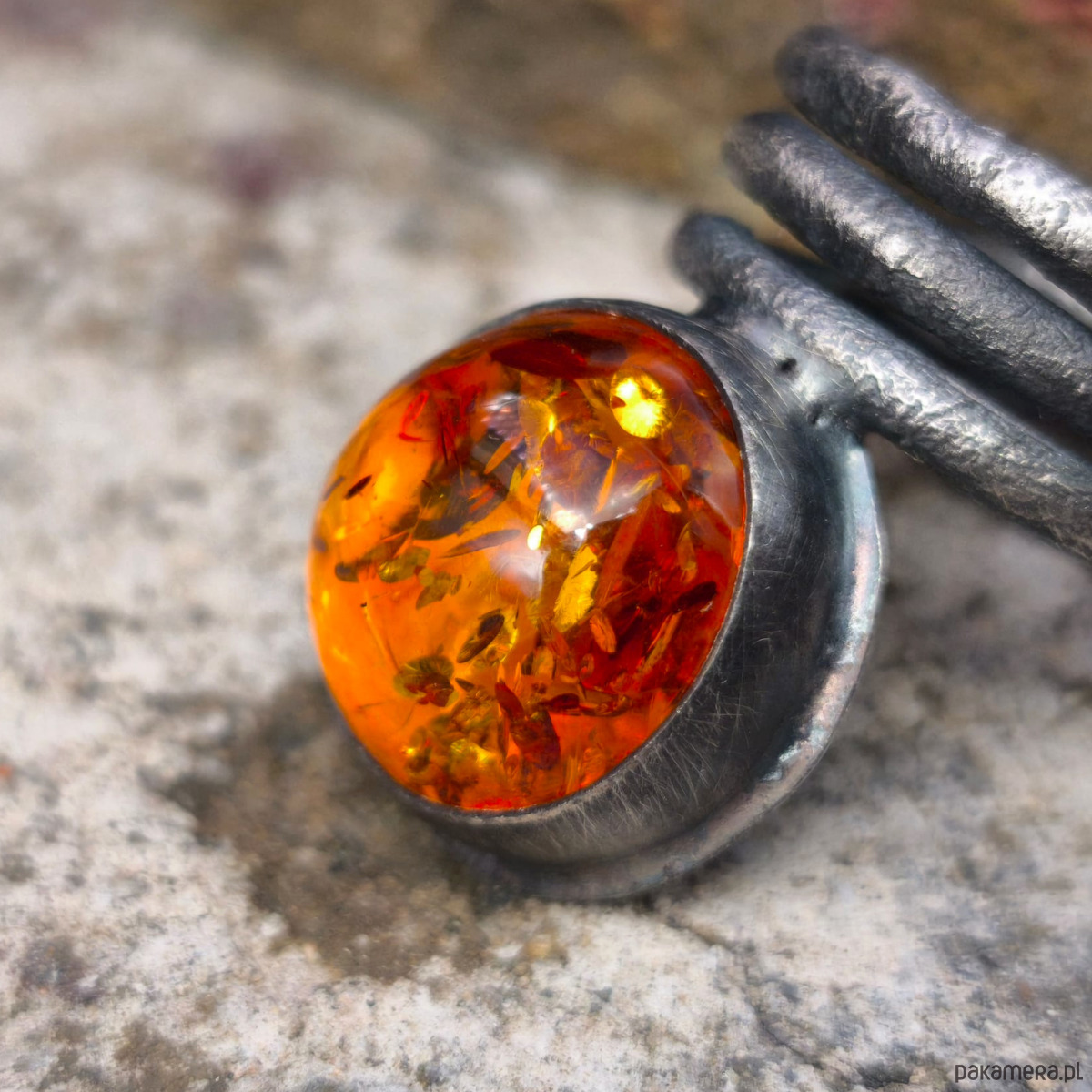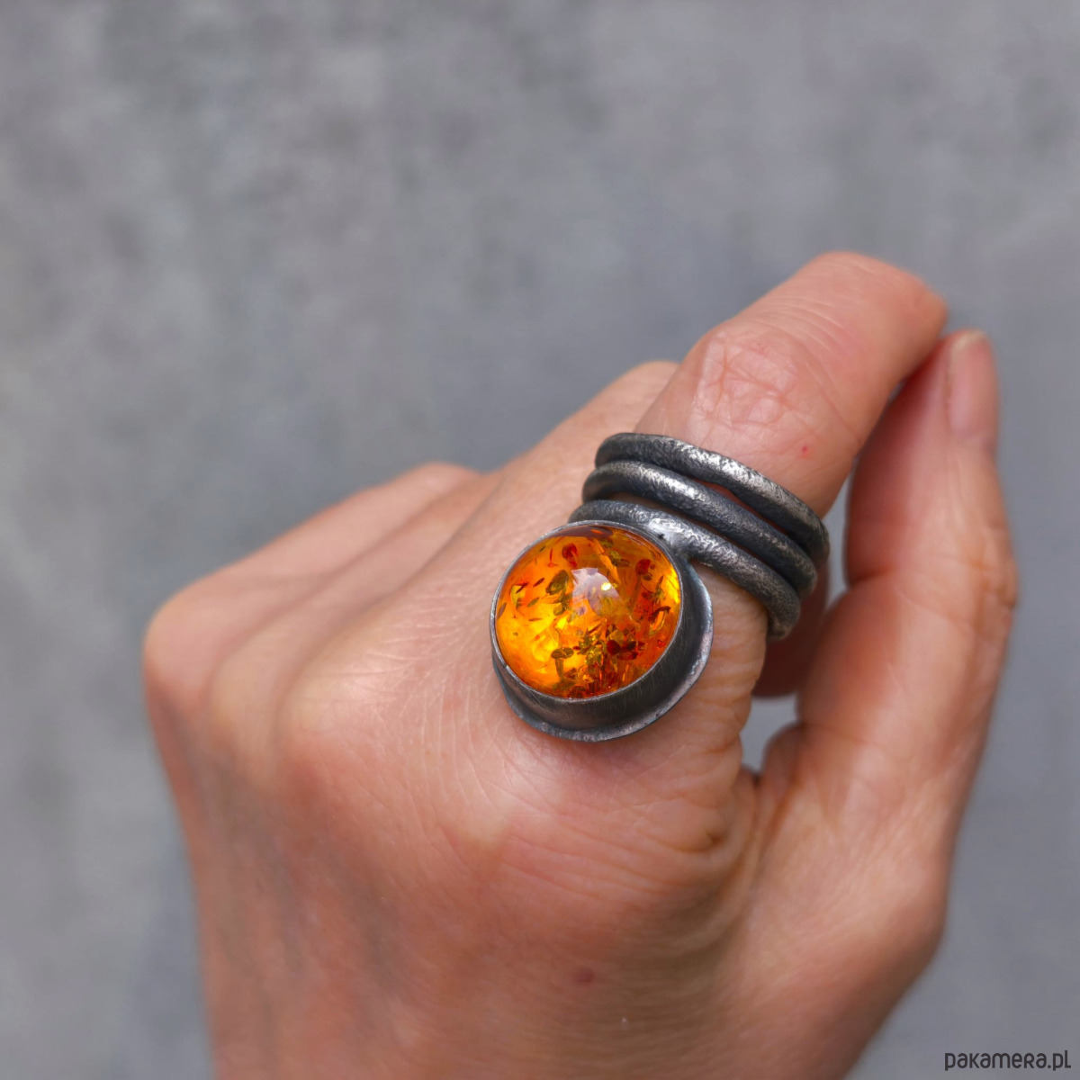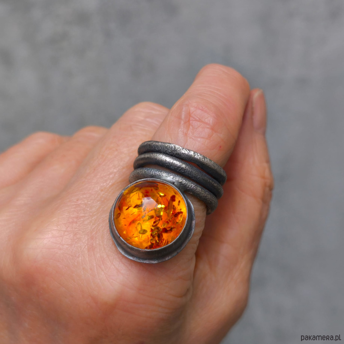 Wyrazisty, masywny pierścień - bursztyn bałtycki, srebro. Bursztyn jest bardzo ładny, ma ciepły miodowy odcień i liczne łuski.