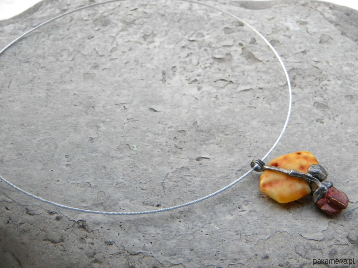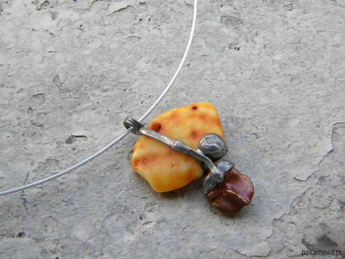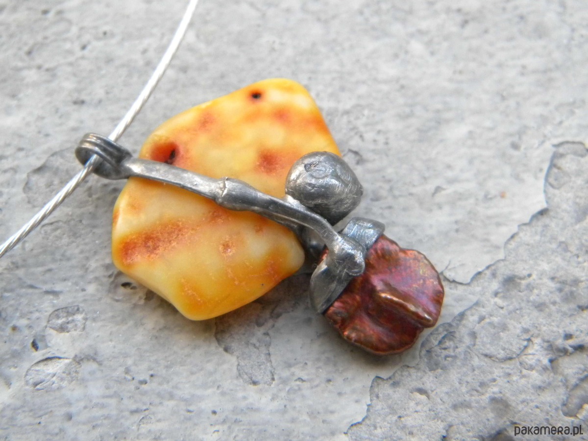 surowy surowy bursztyn i perła w oprawie z ocynowanej miedzi.