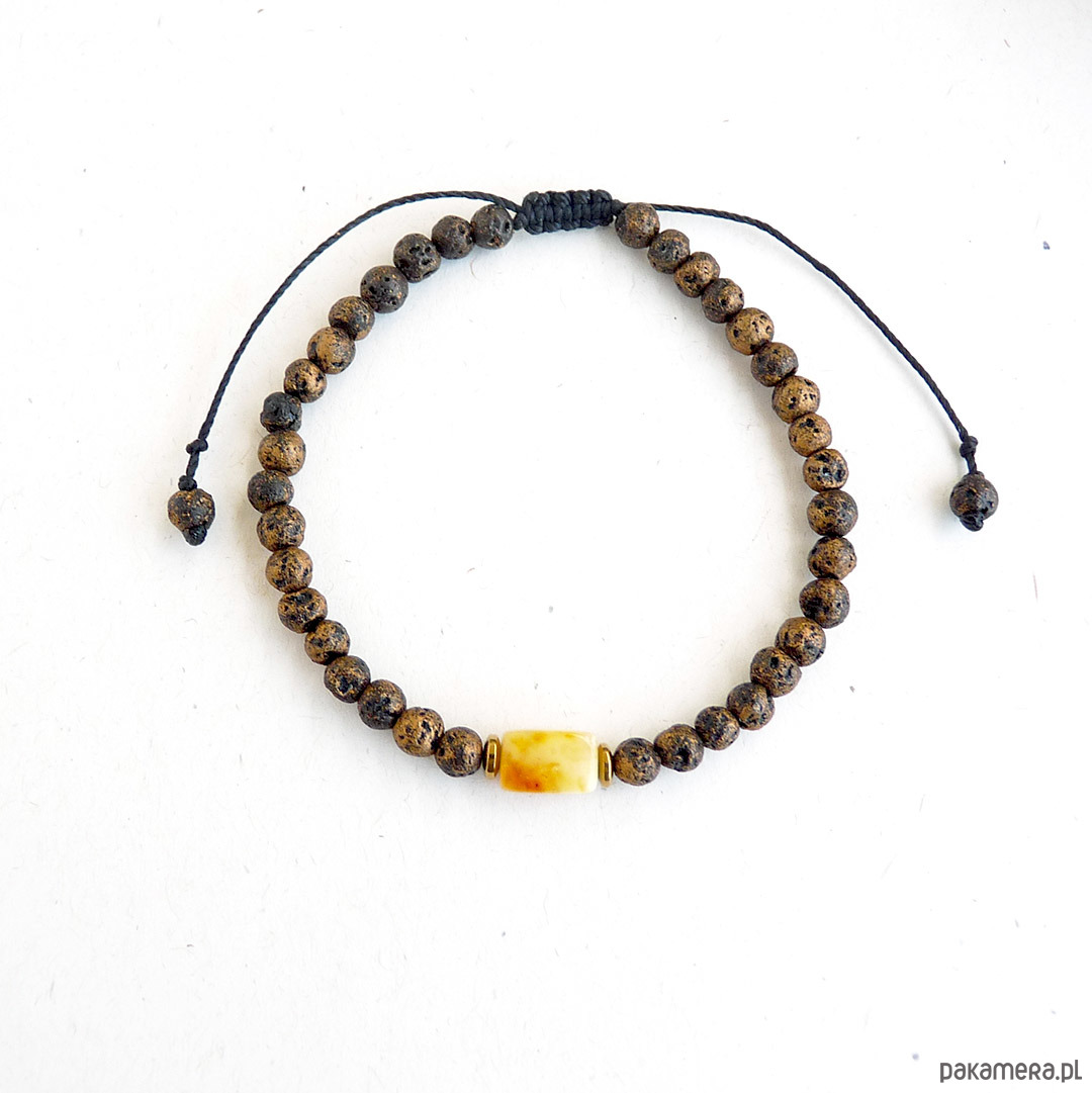 bursztyn bałtycki 8x5 mm, lawa wulkaniczna stylizowana na złoconą, czarny sznurek odporny na przetarcia