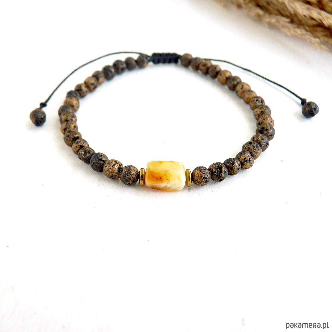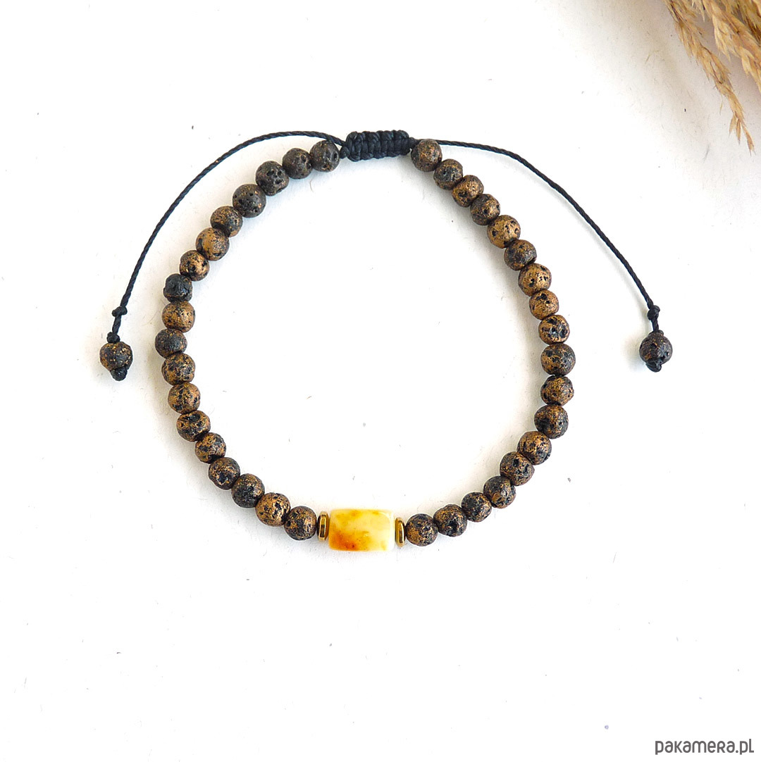 bursztyn bałtycki 8x5 mm, lawa wulkaniczna stylizowana na złoconą, czarny sznurek odporny na przetarcia