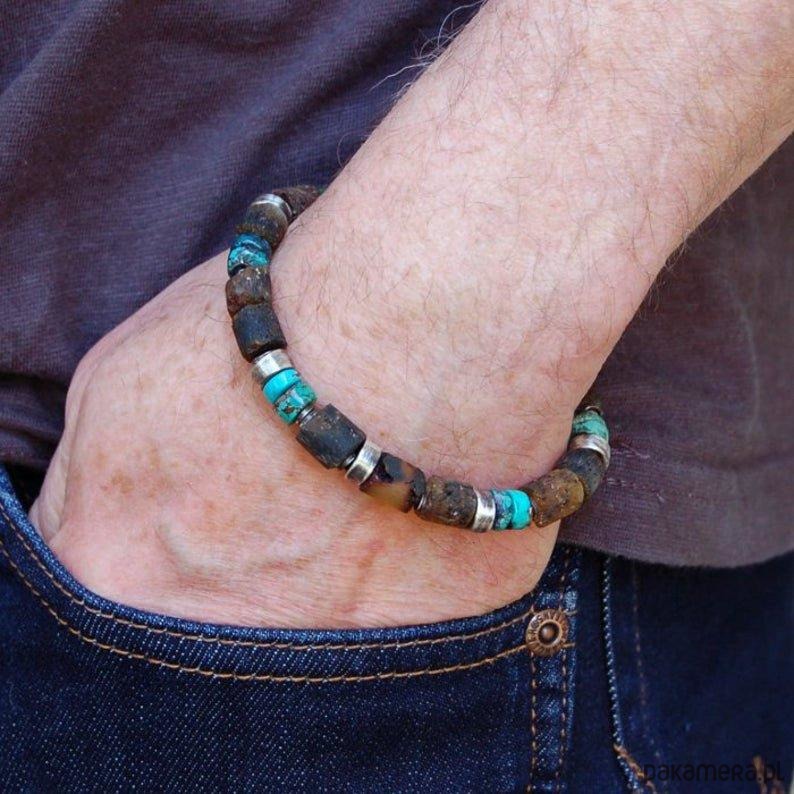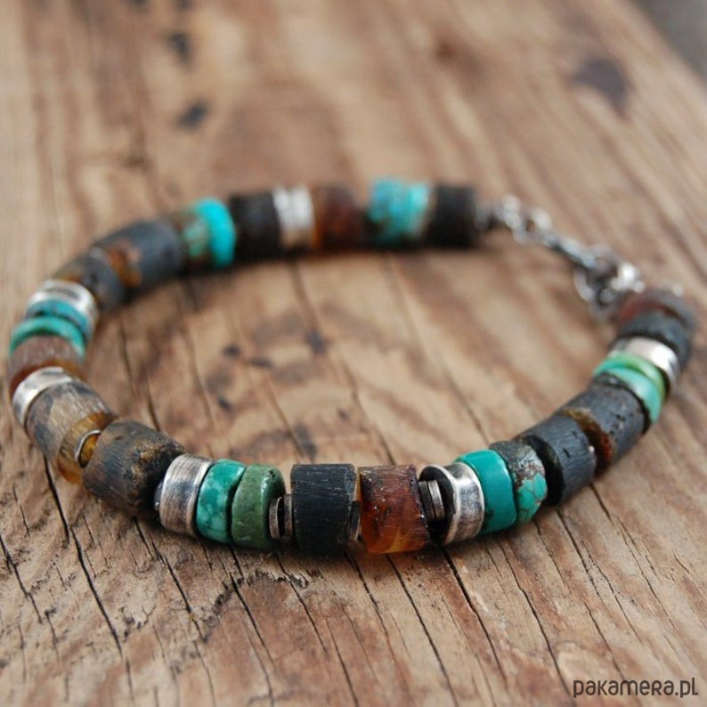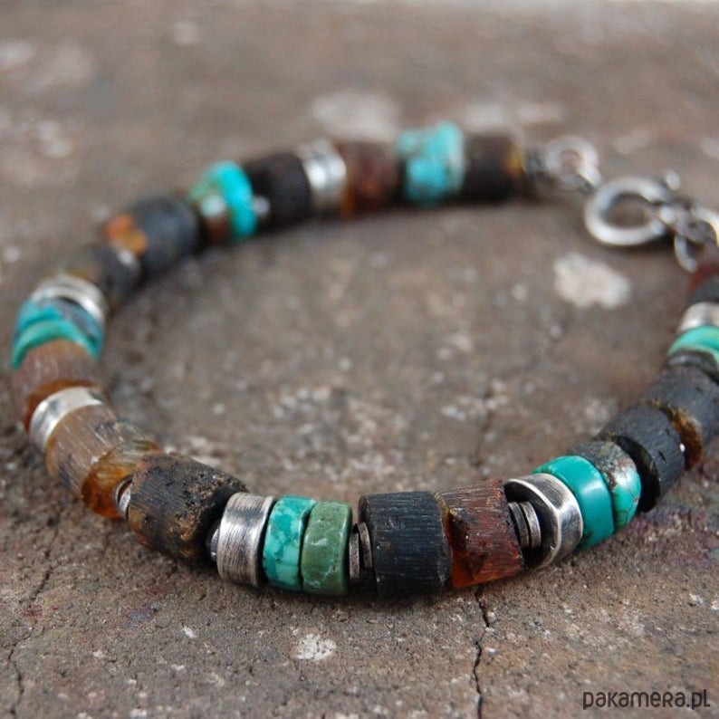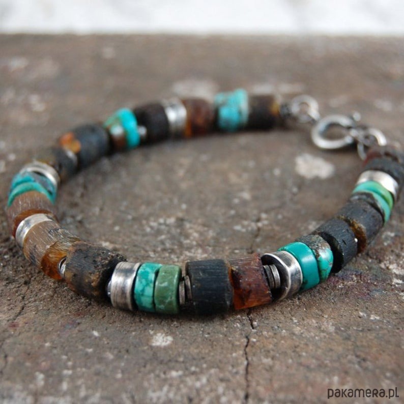 Bransoleta unisex ze srebra, bursztynu, turkusu. Srebro oksydowane. Wielkość bursztynu 0.8 cm, turkusu 0.8 cm. Proszę o podanie obwodu nadgarstka.