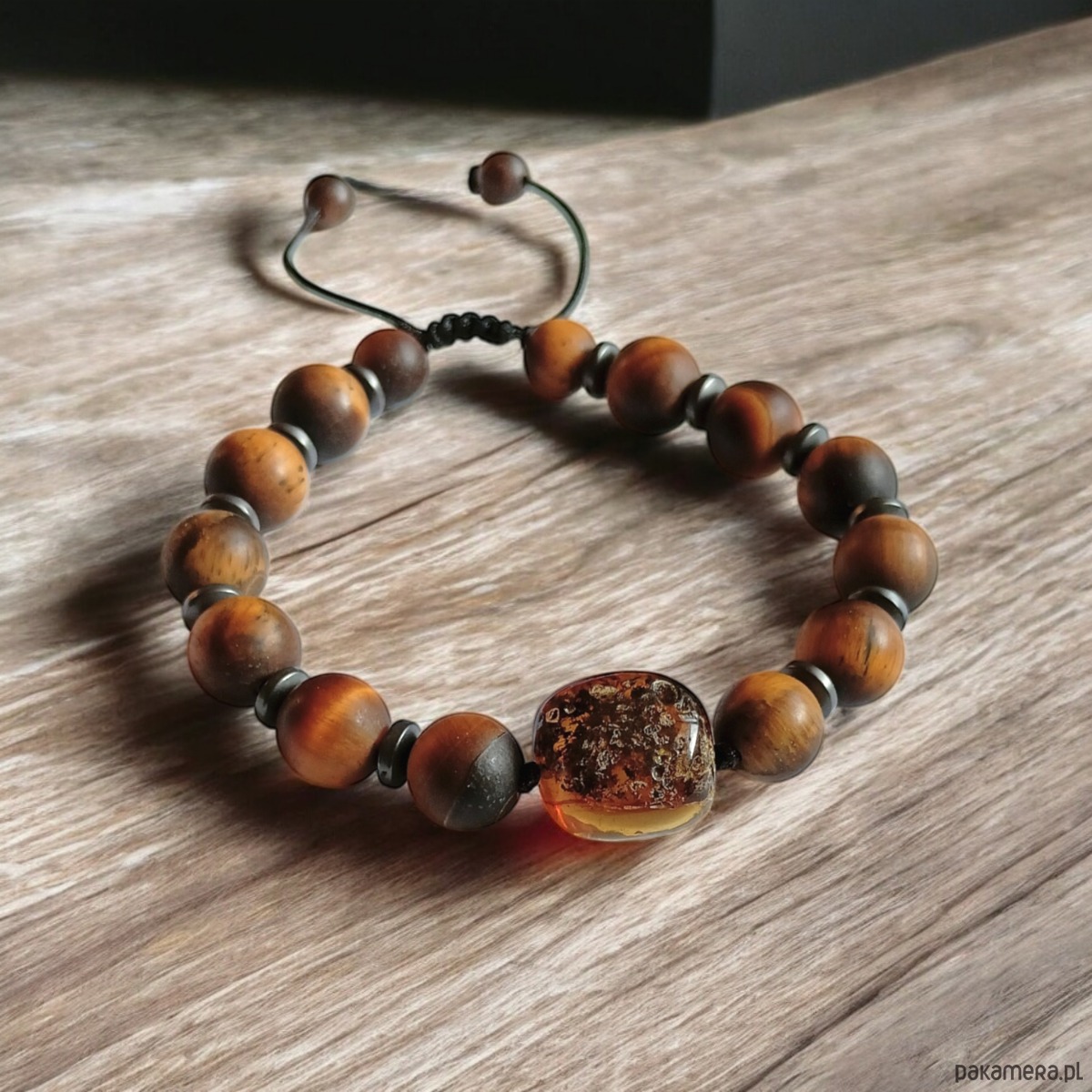 BURSZTYN, tygrysie oko UNIKAT unikatowa bransoletka M-XL