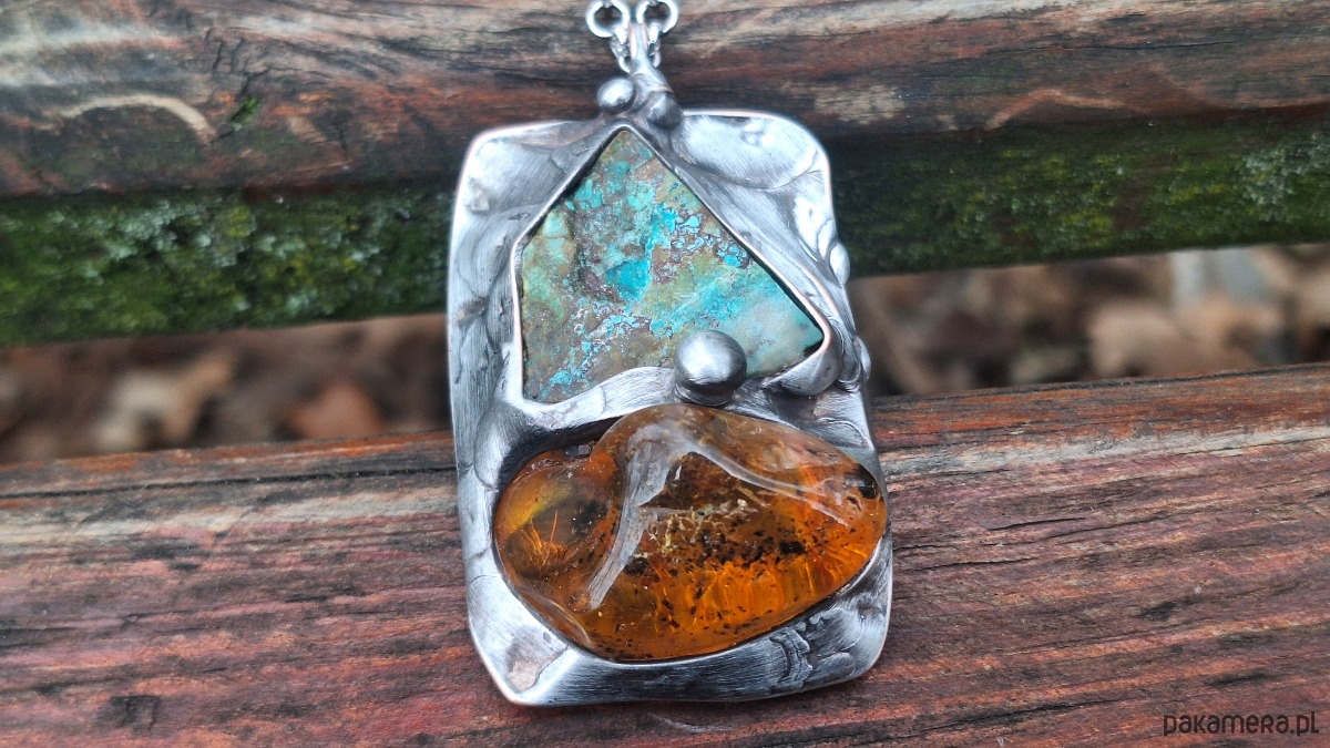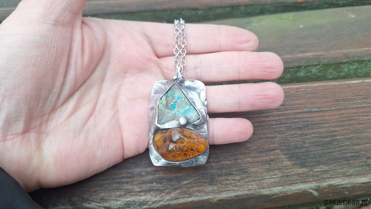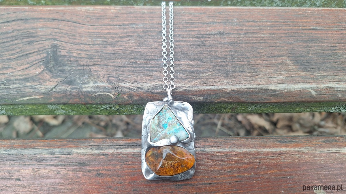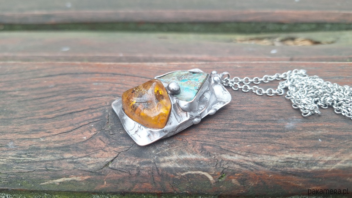 Wisiorek wykonany z miedzi, cyny, surowej chryzokoli i bursztynu. Wymiary ok. 4.5 na 3 cm. Zawieszony na łańcuszku o długości ok. 50 cm.