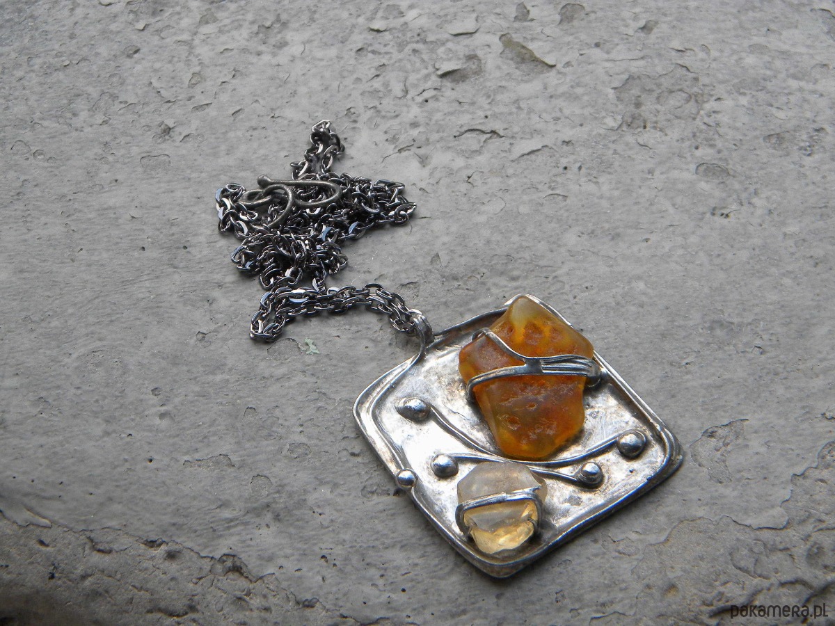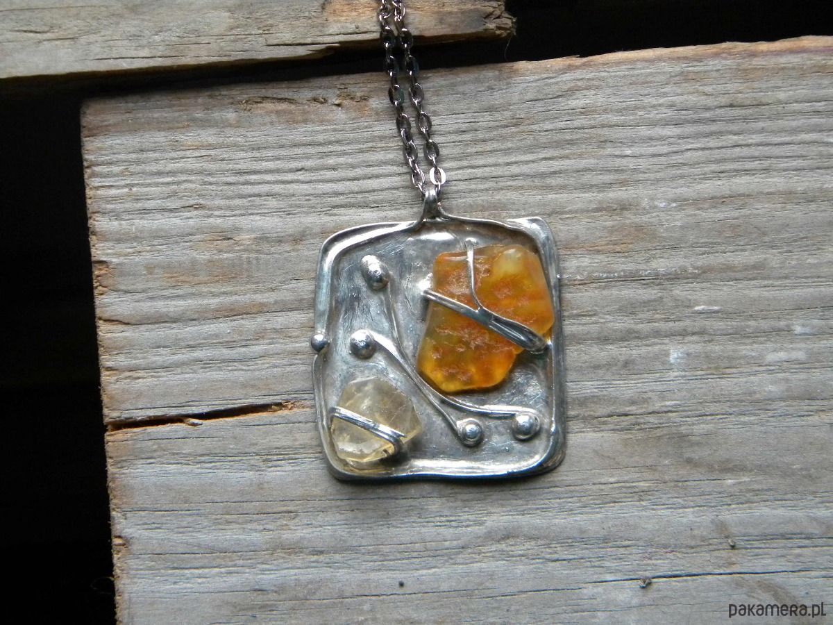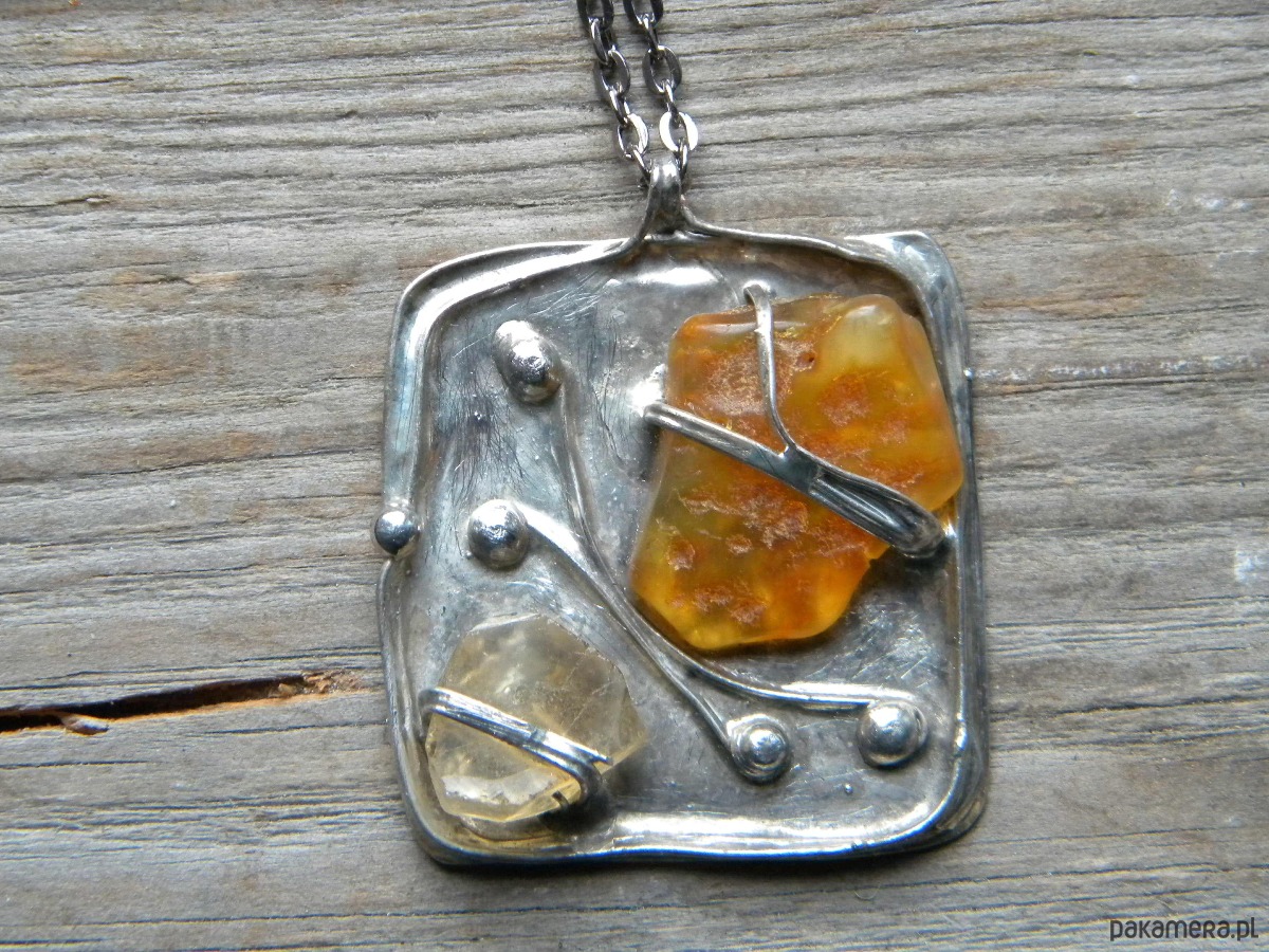 naszyjnik z bursztynu i cytrynu w ocynowanej miedzi.