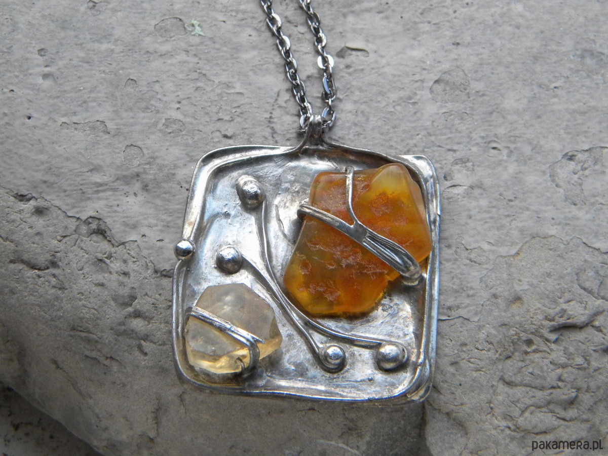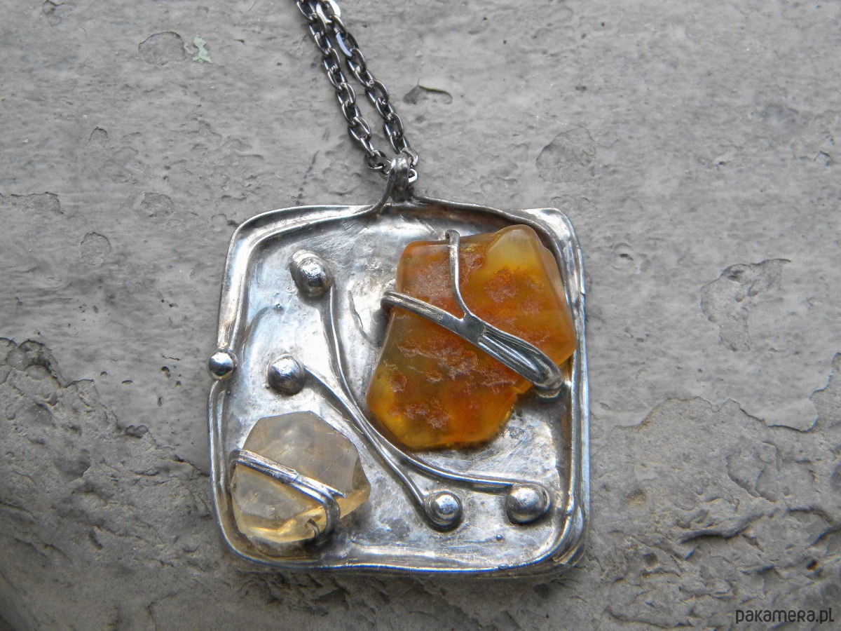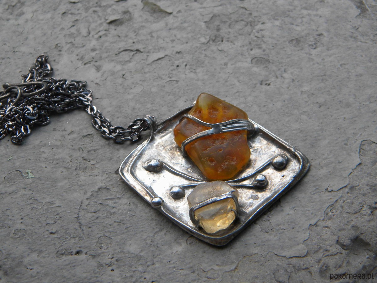 naszyjnik z bursztynu i cytrynu w ocynowanej miedzi.