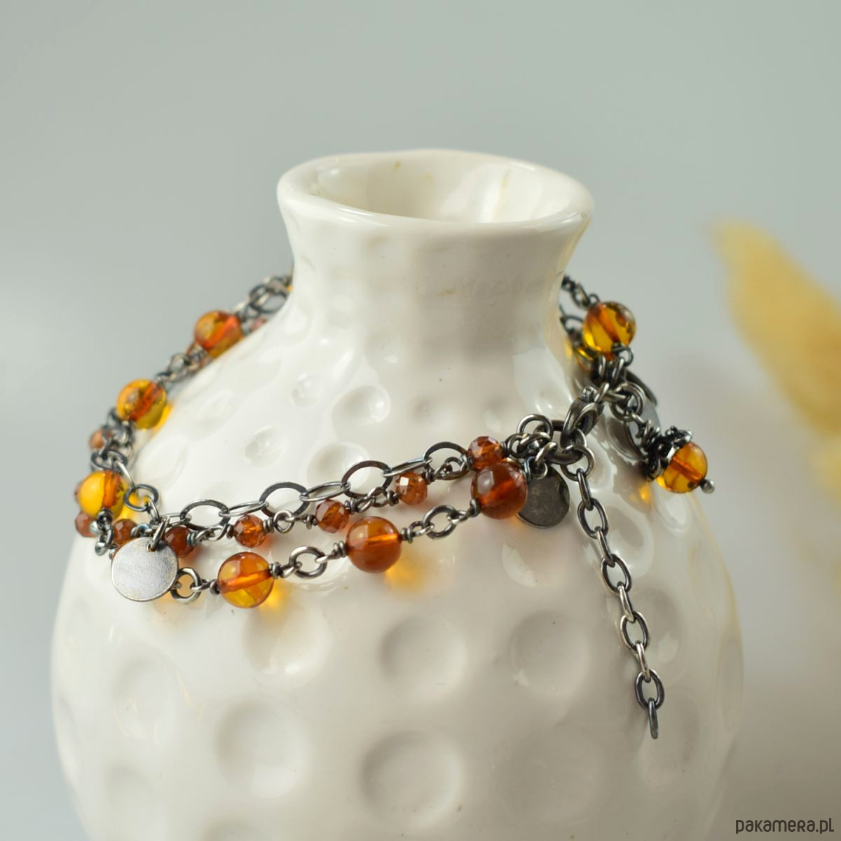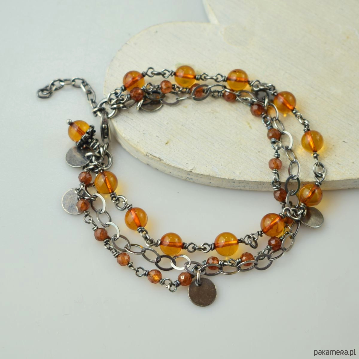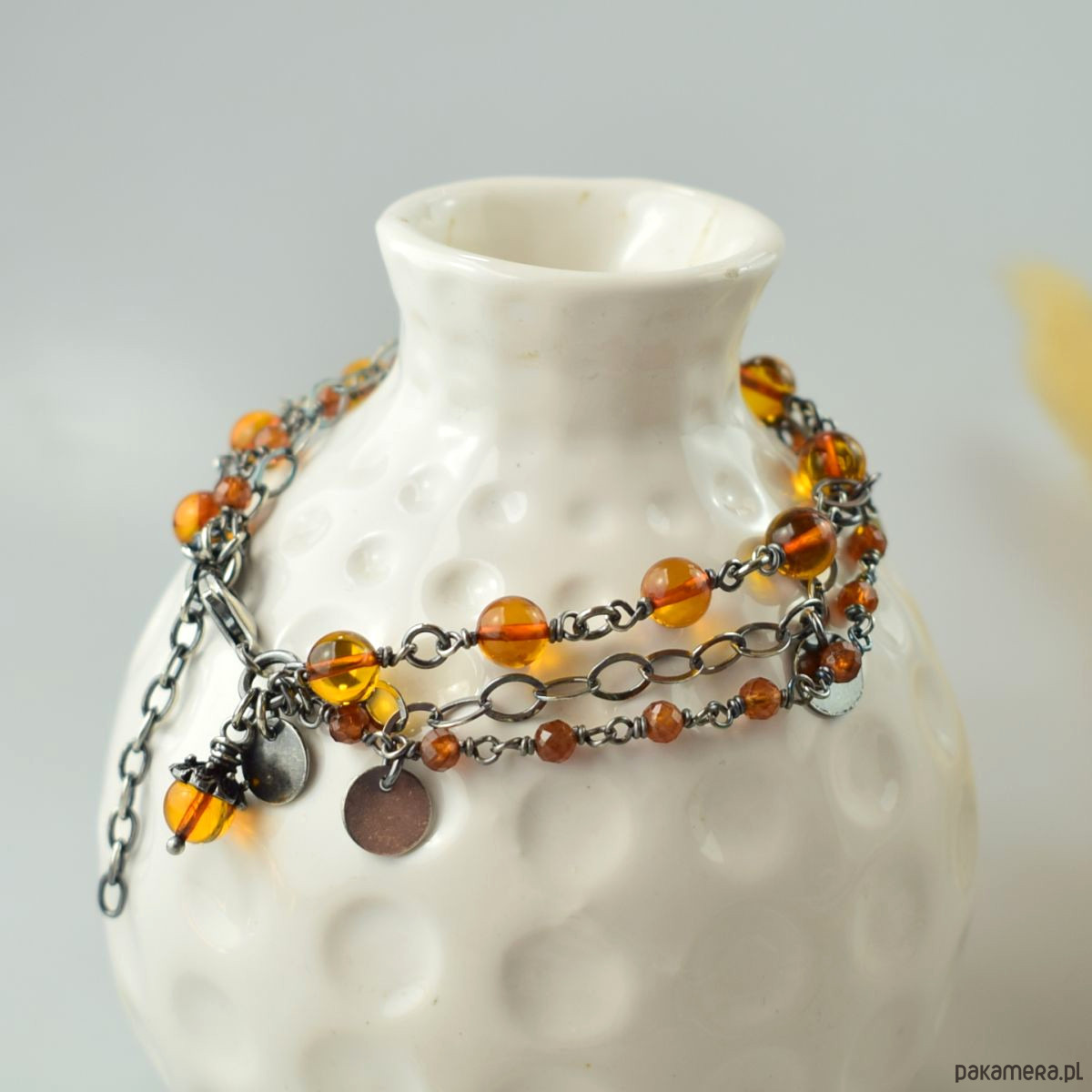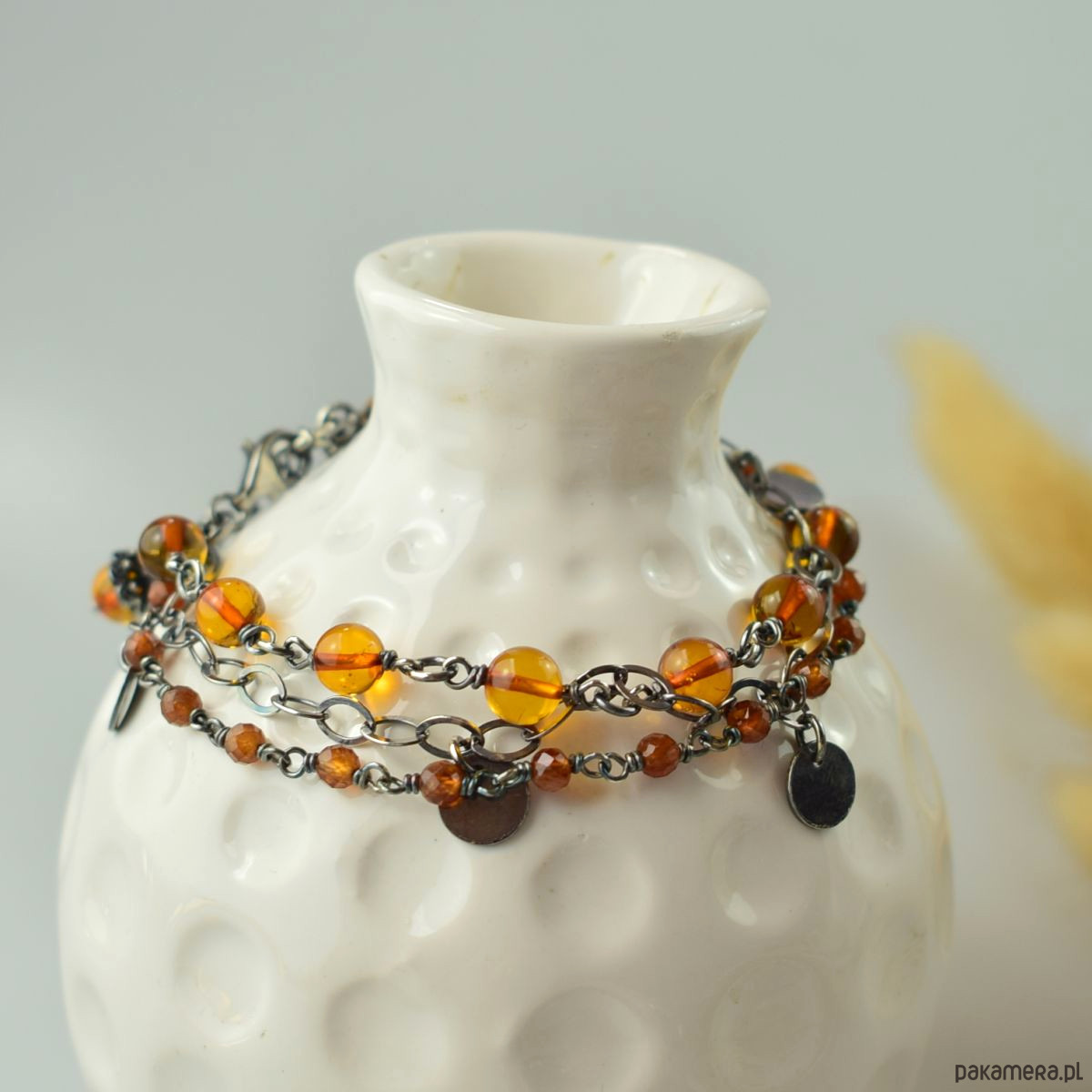 Bransoletka wykonana w całości ze srebra (próba 925) z bursztynem i granatem. Całość została zoksydowana (przyciemniona) i wypolerowana. Długość regulowana 20 - 23 cm. Biżuteria zostanie ozdobnie zapakowana.