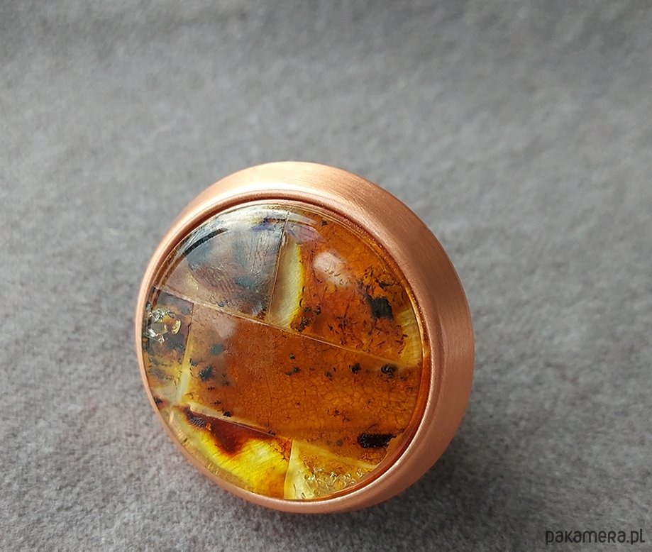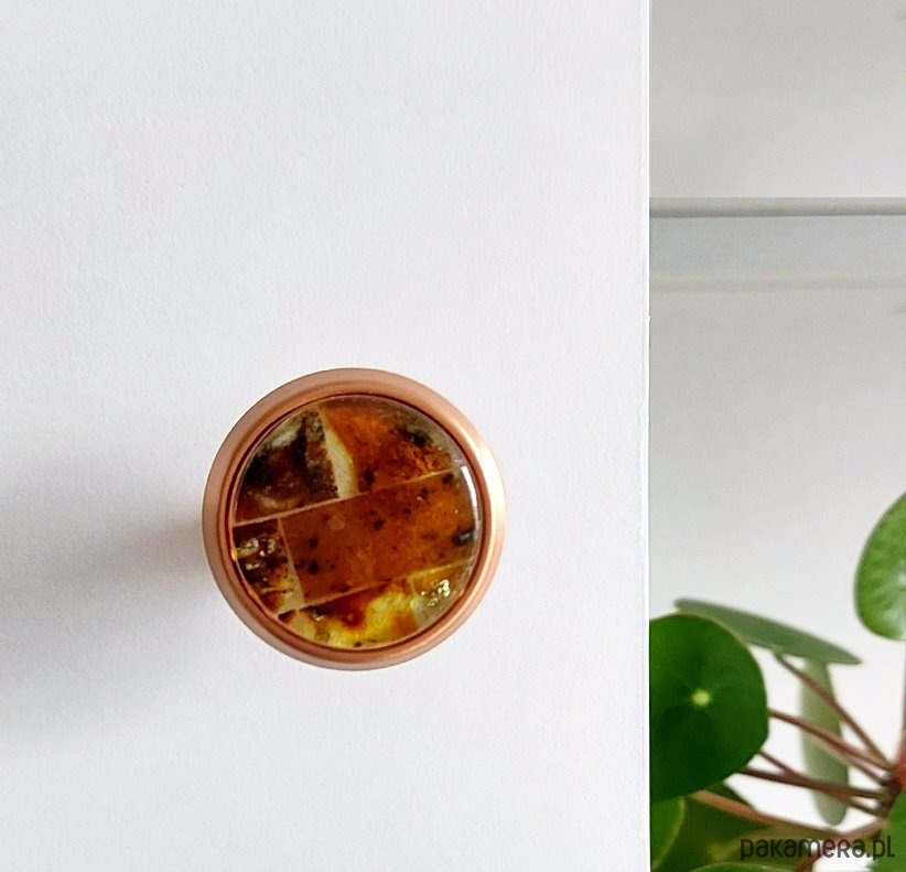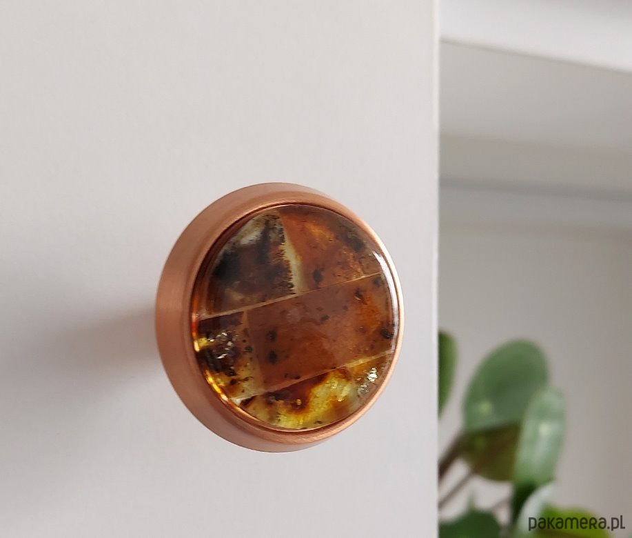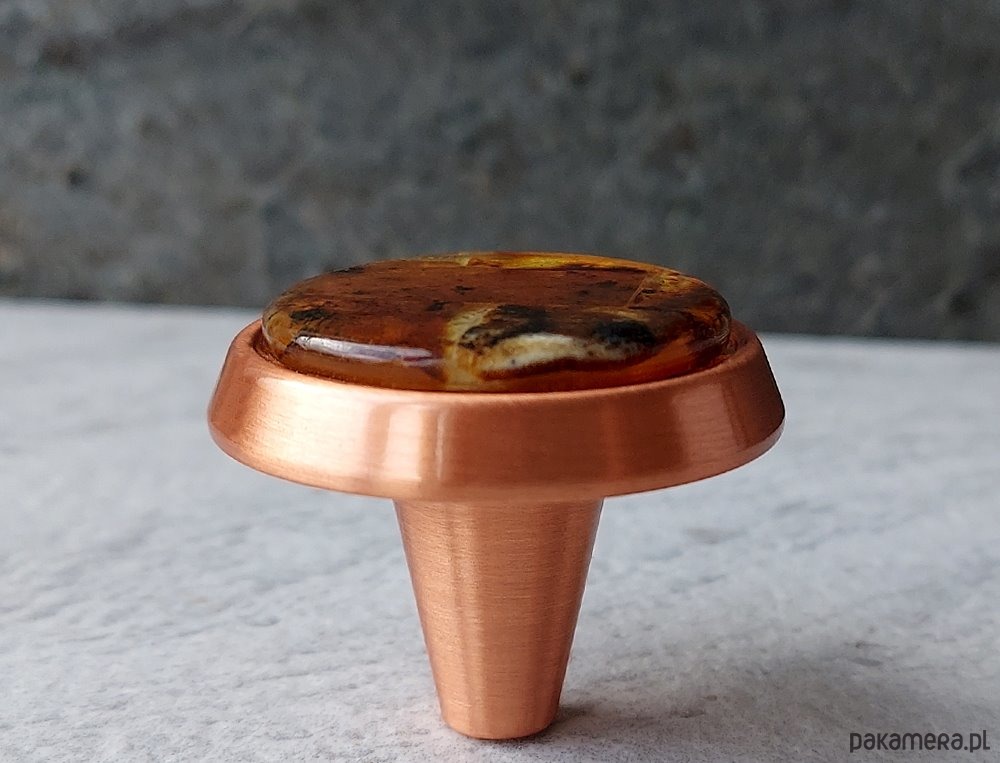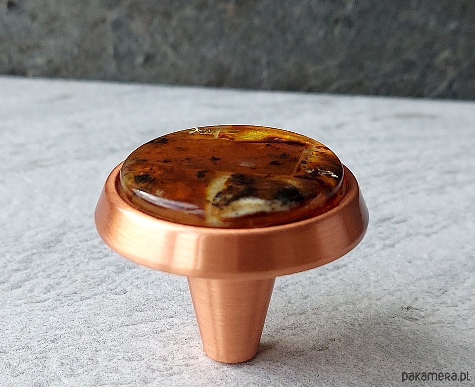 Korpus gałki wykonany z metalu w stopniu wykończenia miedziany.