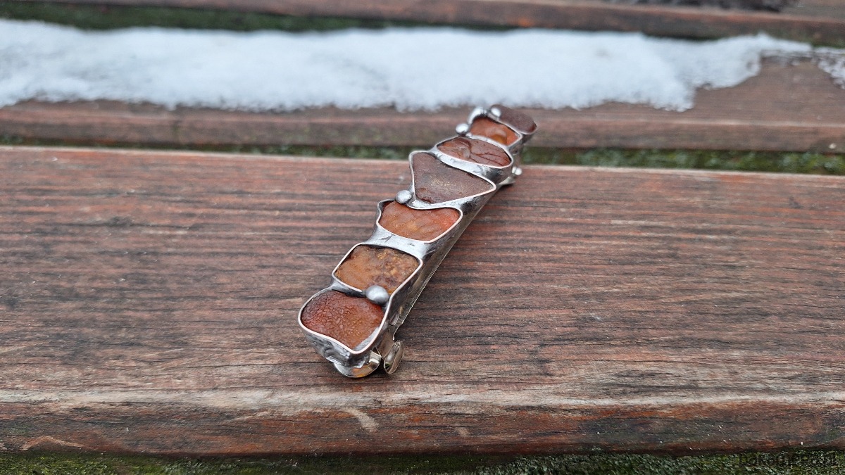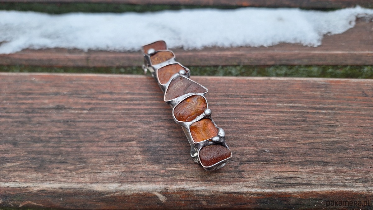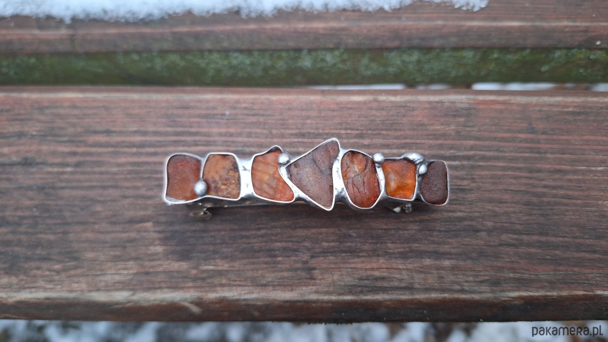 Klamra do włosów, wykonana z miedzi, cyny i bursztynów. Wymiary ok. 8 na 1.5 cm. Zapięcie 6 cm, metalowe.