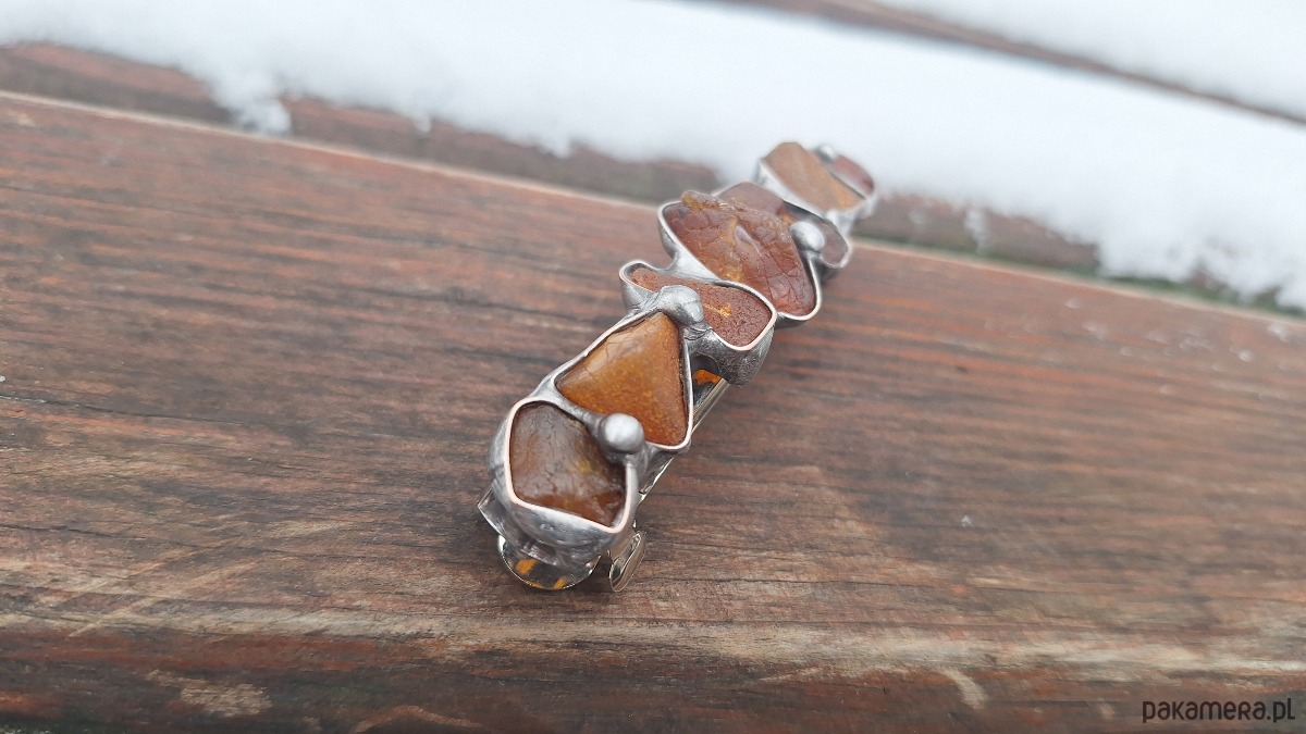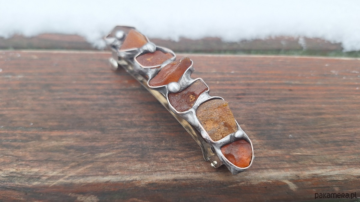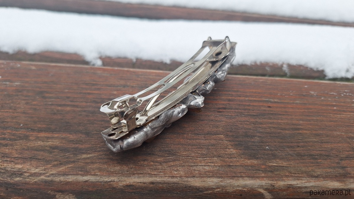 Klamra do włosów, wykonana z miedzi, cyny i bursztynów. Wymiary ok. 8 na 2 cm. Zapięcie 6 cm, metalowe.