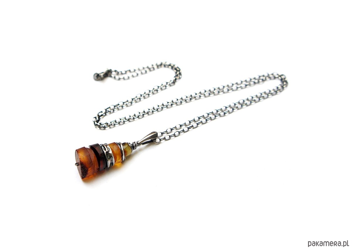 Naszyjnik wykonany ze srebra pr. 925 w połączeniu surowymi plastrami bursztynów [14mm -9mm], oraz oponką bursztynu [6mm]. Całkowita długość naszyjnika59,5cm. Srebro oksydowane i przetarte. Biżuteria ozdobnie zapakowana