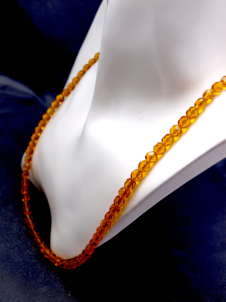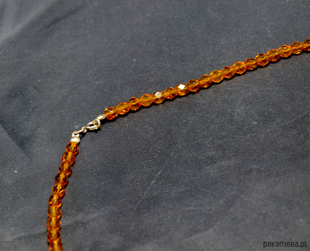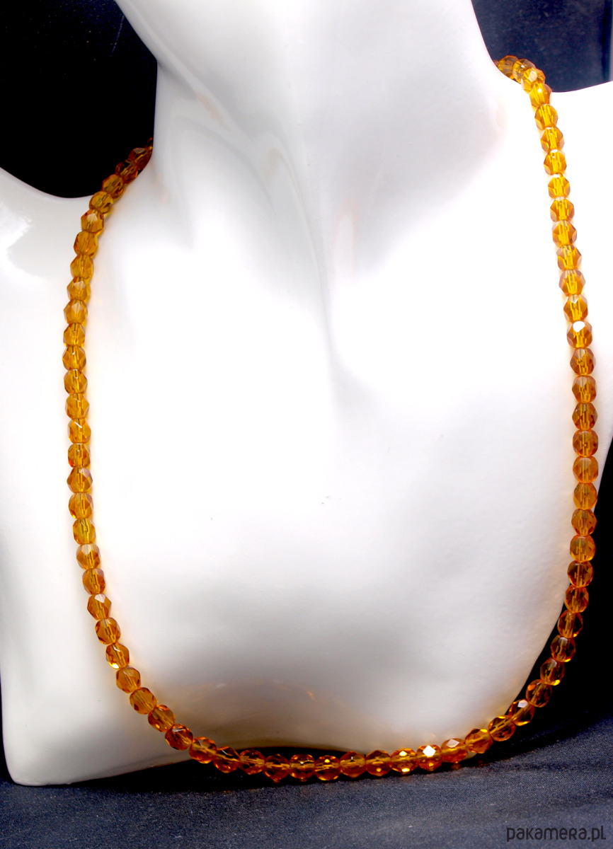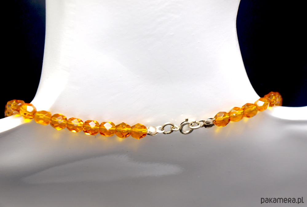 Korale ze szlifowanych szklanych elementów w bursztynowym odcieniu. Całość zapinana na srebrne zapięcie.